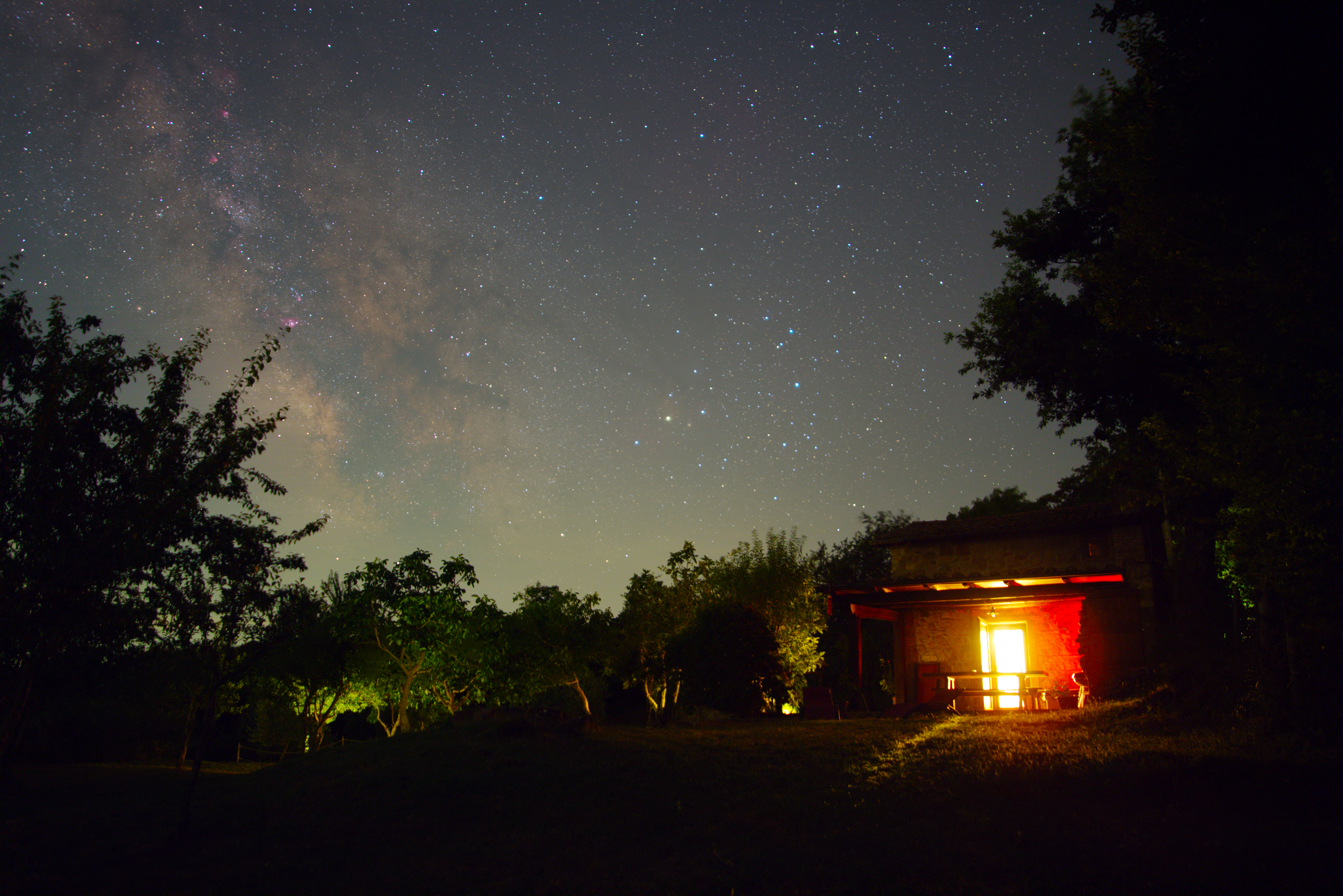 Wer zu Hause im Münsterland Anfang Juli weder klare noch astronomische (also wirklich dunkle) Nächte genießt, der könnte sein Glück 1500 km weiter südlich versuchen. Die südliche Toskana zwischen Castell'Azzara und dem Lago die Bolsano ist sehr dünn besiedelt und bietet abseits der wenigen Siedlungen einen tollen Bortle-4-Himmel – hier kann man die Milchstraße mit bloßem Auge deutlich ausmachen, sobald nach etwa 23 Uhr, die astronomische Nacht einsetzt.