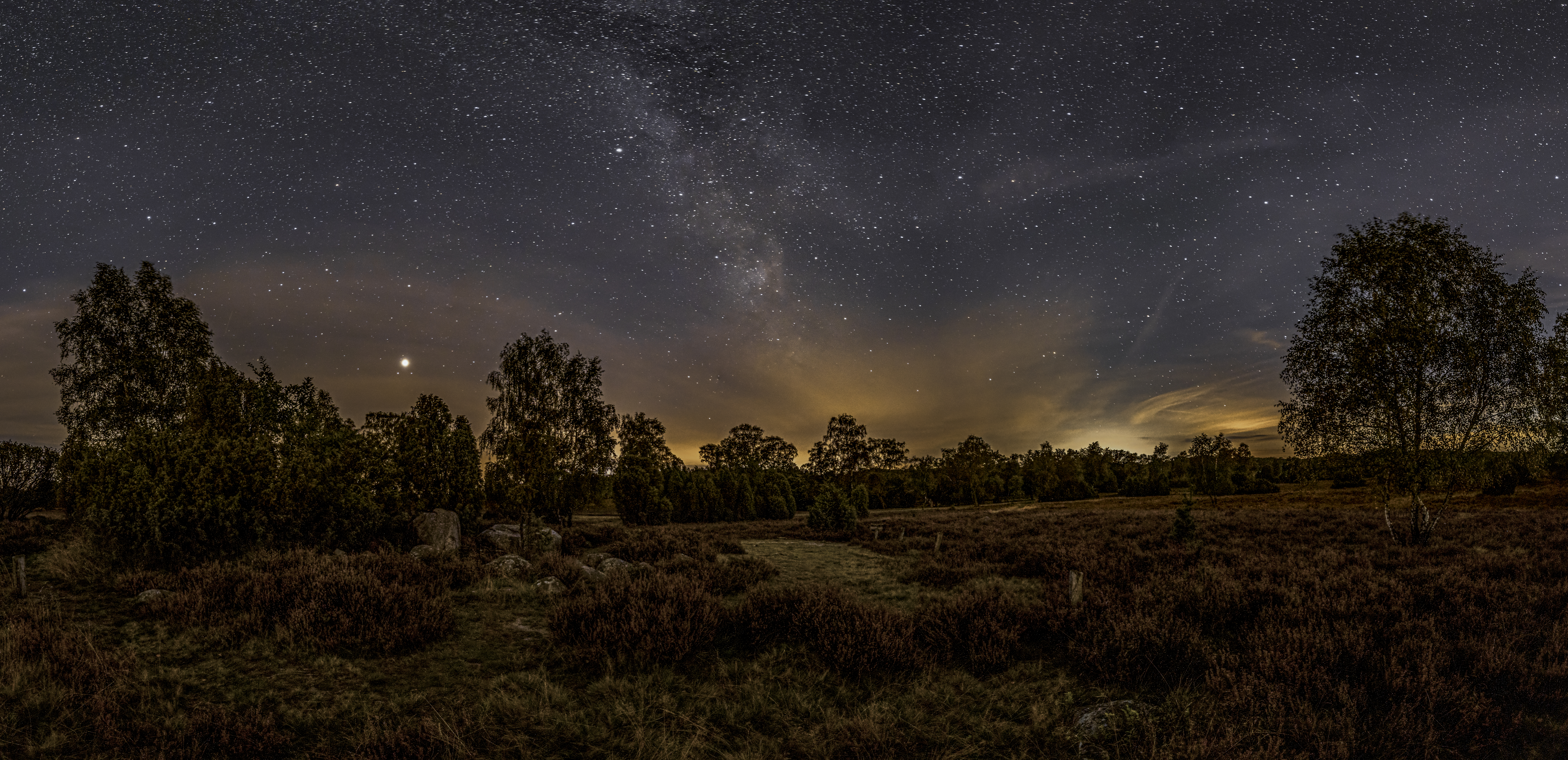Sommernacht bei »Hannibals Grab« in der Lüneburger Heide unter dem Licht der Milchstraße. Panorama aus fünf Hochformataufnahmen.