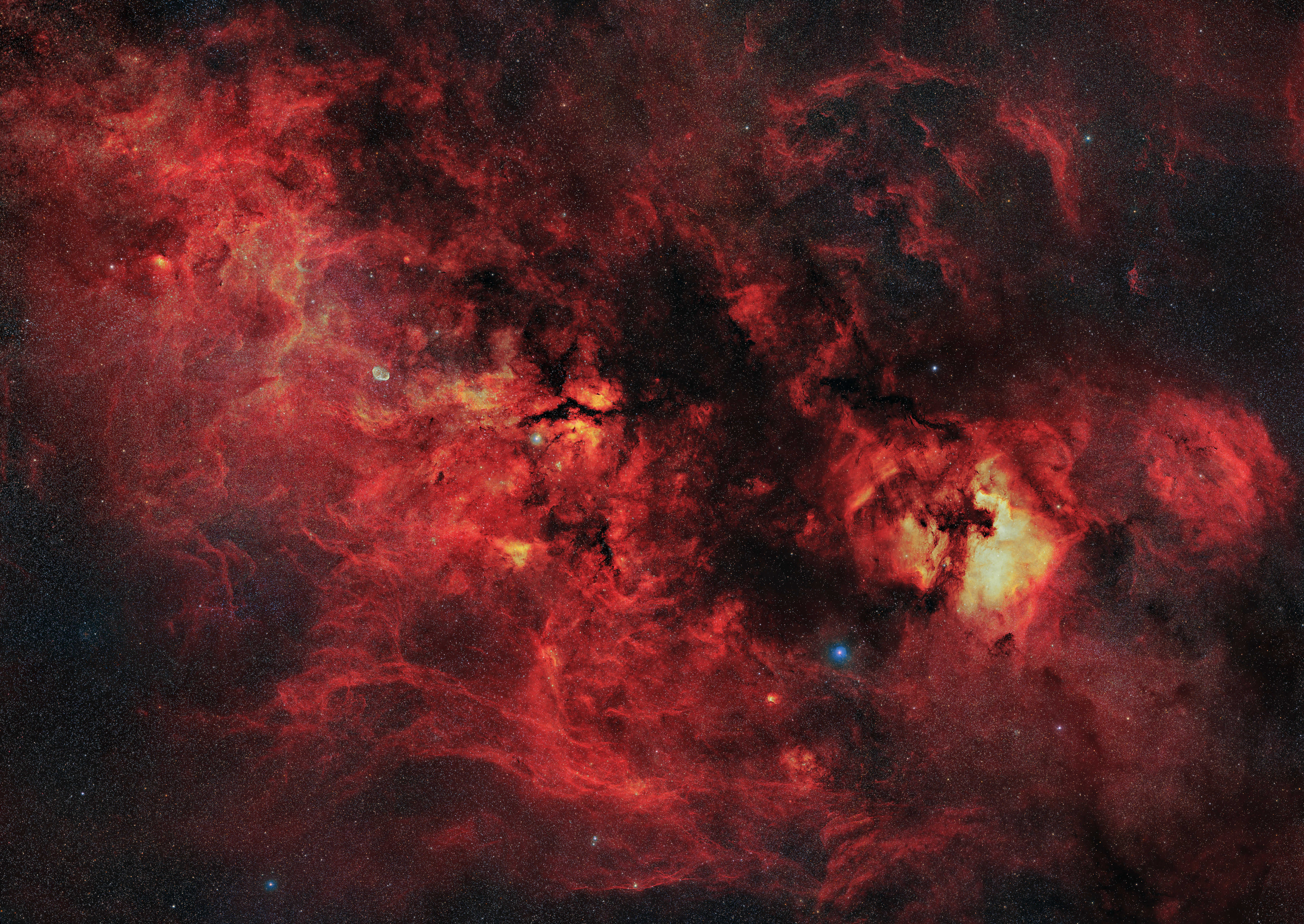 Übersichtsaufnahme aus neun Einzelbildern der H-Alpha und OIII-Gebiete im Sternbild Schwan.