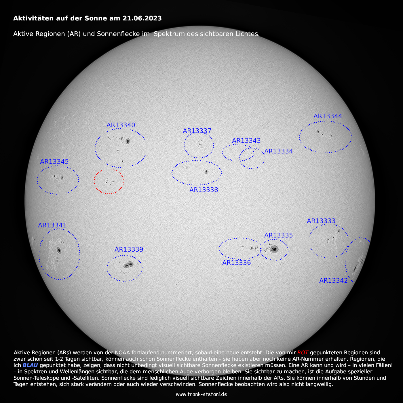 Durch anhaltend dunstige Luft mit vielen Schleierwolken, die ohnehin kurzen Sommernächte und die typischer Weise abends zunehmende Bewölkung hier in den Alpen, dient mir schon seit längerer Zeit die Sonne als Beobachtungsobjekt. Für mich als Beobachter und Fotograf im visuellen Spektrum des Lichtes, ist sie zur Zeit ein sehr dankbares Objekt. Es gibt zahlreiche Aktivitäten, die ohne spezielle Sonnenteleskope bereits auf der Photosphäre beobachtet werden können. Stolze 13 Aktive Regionen (AR) bringen gerade zahlreiche Sonnenflecke hervor - ein Zeichen, dass darunter wirklich viel magnetische Aktivitäten und andere turbulente Ereignisse stattfinden. Rein visuell sind die beiden parallel zum Sonnenäquator verlaufenden Reihungen mit Sonnenflecken auffällig, beide von Sonnenrand zu Sonnenrand und reich gefüllt. Die Region des Sonnenäquators selbst, sowie die beiden Polarregionen sind dagegen inaktiv und erscheinen blitzblank.