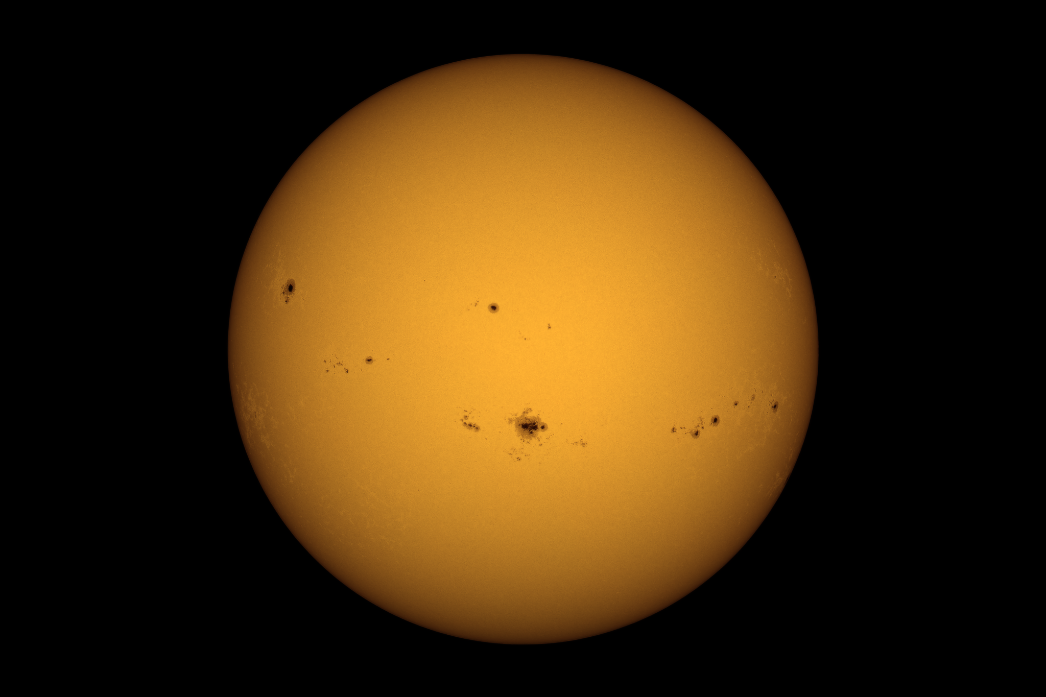Die Riesengruppe AR 3780 exakt in der Mitte der Sonne. Trotz einiger Quellwolken immer wieder größere Lücken. Das Seeing war mäßig gut, aber auch nocht völlig unbrauchbar.