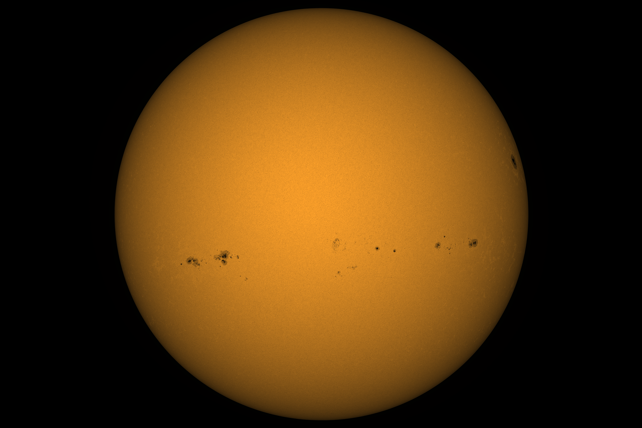 Fleckengruppen in der Nähe des Sonnenäquators, aufgereiht wie an einer Perlenkette. Die Nordhalbkugel legt erneut eine Pause ein. Das Seeing war auf Grund einer starken Inversion, die derzeit über uns liegt, absolut super. Kaum Gewackel des Sonnenbilds auf dem Monitor.