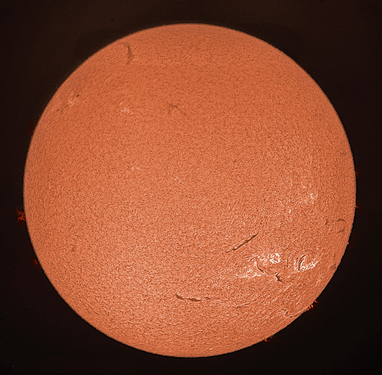Am späten Nachmittag klarte der Himmel auf und offenbarte ein sehr gutes Seeing. Während die Fleckengruppen 2320 und 2323 am rechten südlichen Sonnenrand verschwinden, taucht am linken nördlichen Rand die Fleckengruppe 2321 auf, die der Sonne wesentlich stärkere Aktivität bescheren dürfte.