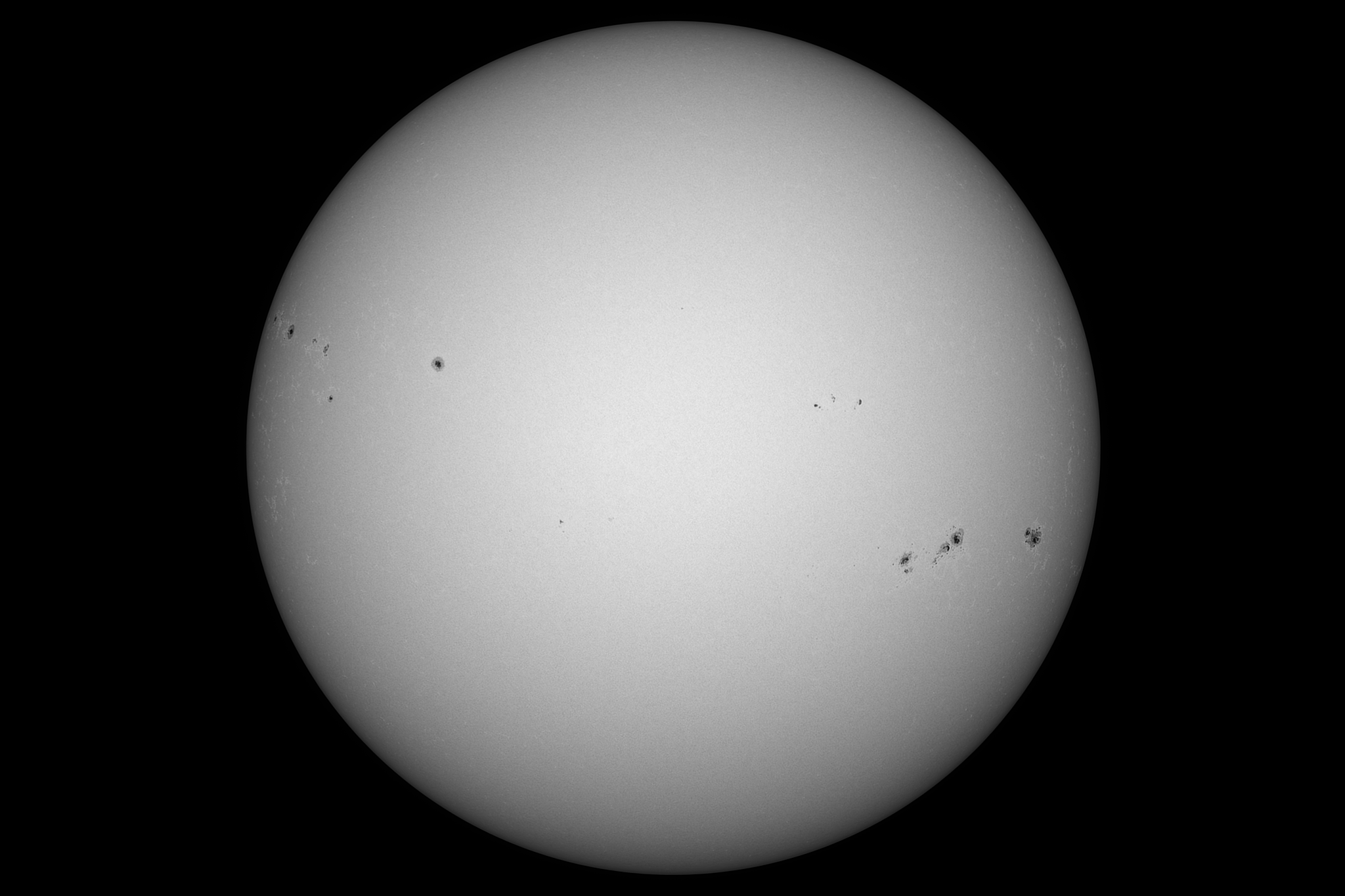 Der Dunstschleier in der Atmosphäre (Rauchaerosole) ist verschwunden. Heute wieder relativ gute Transparenz, um die neue Aktivitätsphase im Bild festzuhalten. Die Sonne heute am 12. Juni 2025 – wieder eine leichte Zunahme der Flecken – ausgewogenes Verhältnis zwischen Nord- und Südhalbkugel. Das Seeing war stellenweise richtig super. Oft reihenweise hintereinander wunderschön scharfe RAWs.