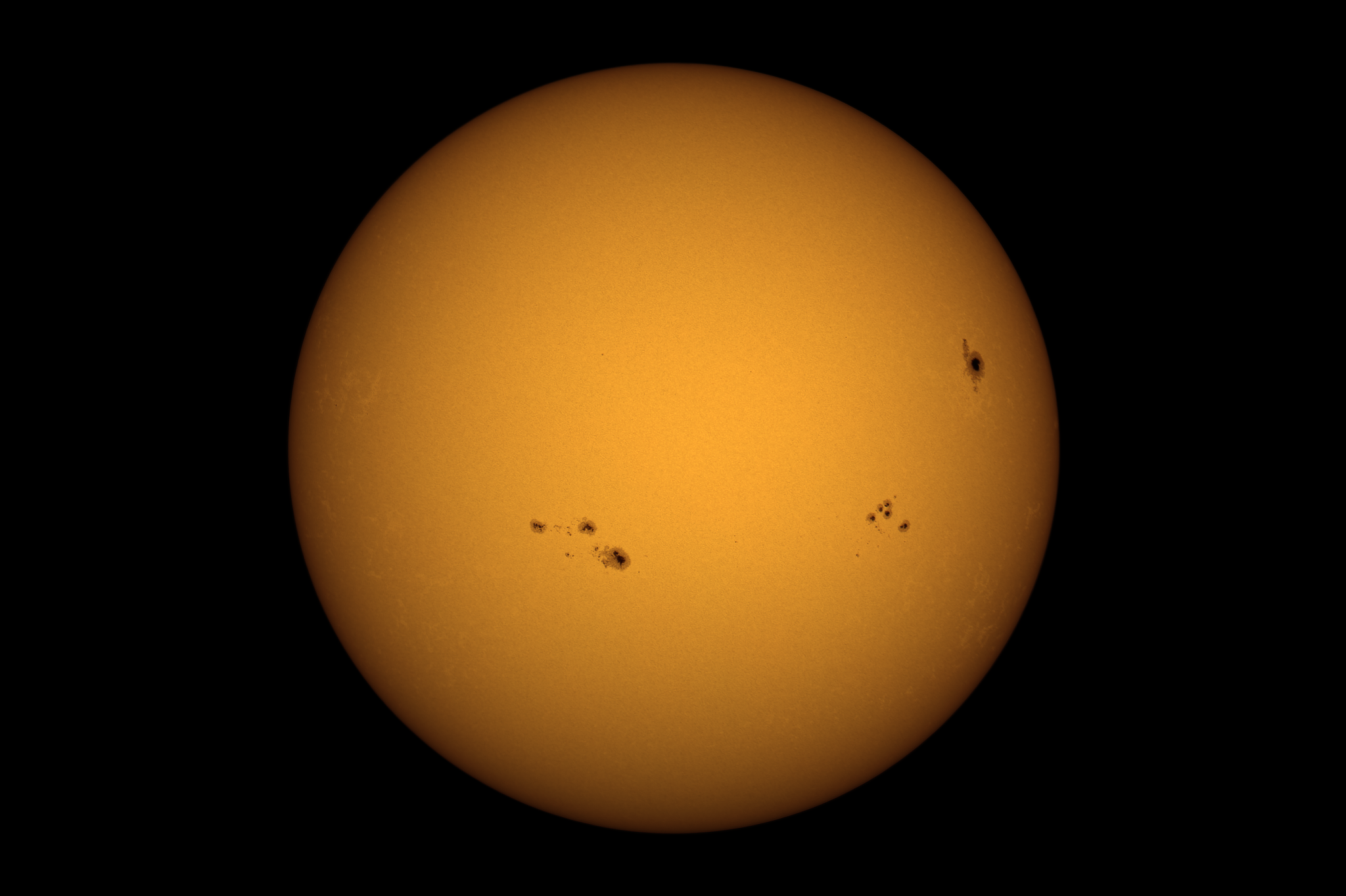 Bevor das Wetter morgen zum Sontag erneut zu Dauergrau und Regen umschwenkt, heute noch ein schneller Blick zur Sonne. Weiterhin bestimmen herrliche Fleckengruppen den Anblick unseres Zentralgestirns. Die Bedingungen waren nicht mehr optimal: dünner Zirrus aus Südwest und zunehmender, böhmischer Wind aus Südost kamen hinzu. Dennoch fanden sich in den vielen RAWs einige recht nutzbare für das Foto.