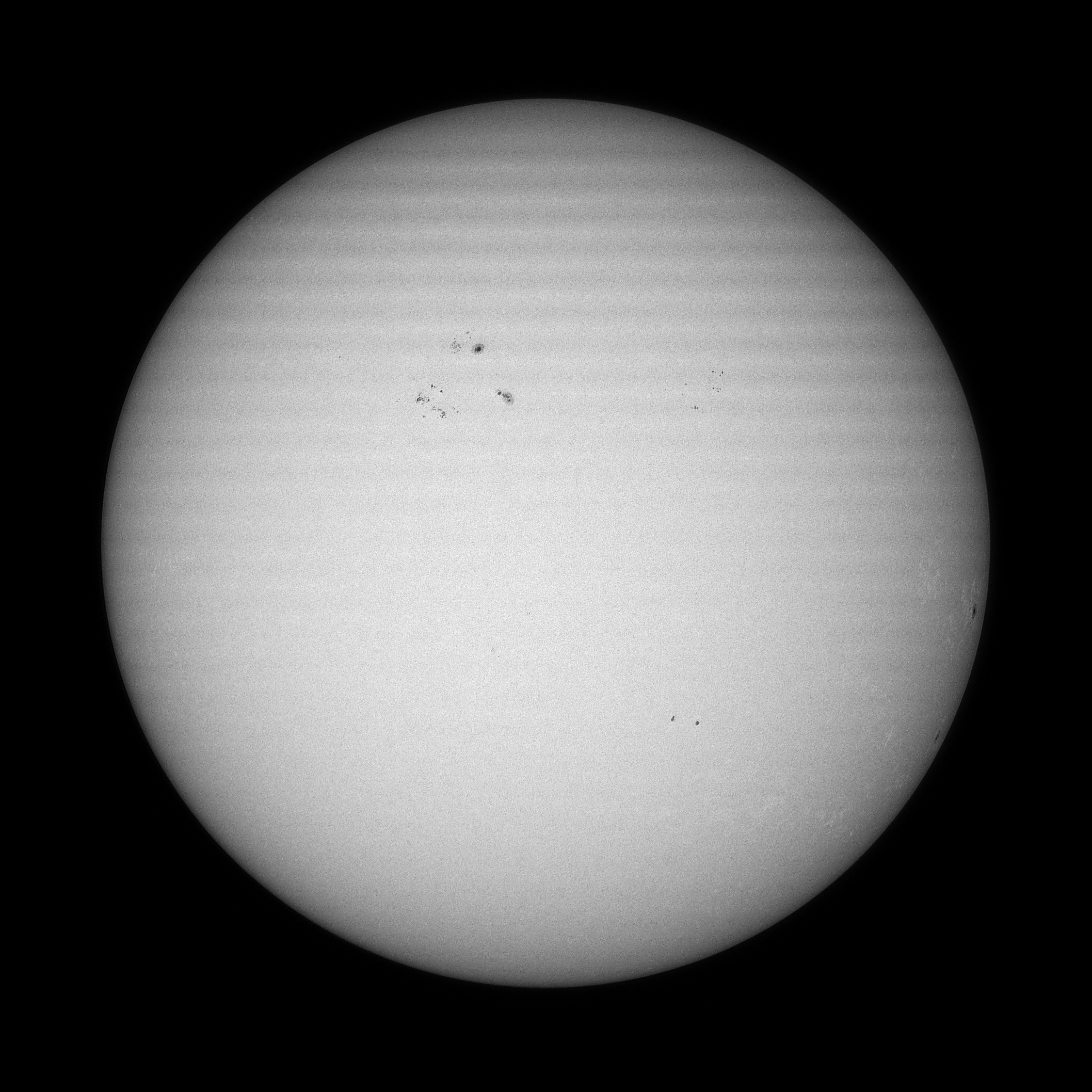 Am 14. Mai 2023 habe ich die Sonne mit dem Baader Solar Continuum Filter und der Baader Sonnenfilterfolie OD 3.8 aufgenommen. Als Teleskop kam ein selbstgebauter 70/900 Fraunhofer Achromat zum Einsatz.