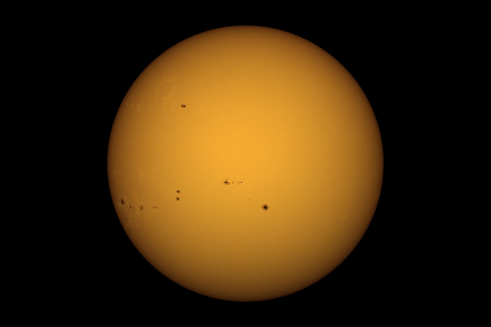 Anlaß der Aufnahme: ein alter Bekannter ist zurück! Unten links, zwischen den beiden übereinander stehenden Flecken, AR 3722 und AR 3724, sowie dem einzelnen ganz links (müsste theoretisch AR 3727 werden) befinden sich drei schwächere Gruppen. Dabei handelt es sich um die Überreste unseres Polarlichtsonnenflecks AR 3664!! Jetzt AR 3723! Somit setzt diese Gruppe, zur dritten (!) Sonnenrotation an. Das ist schon rekordverdächtig und noch immer spuckt die Gruppe M-Flares, kurz vor der X-Kategorie! Die Transparenz heute war gut, leider störte ruppiger Wind die Aufnahmen (leichte Schwingungen des Instruments).
