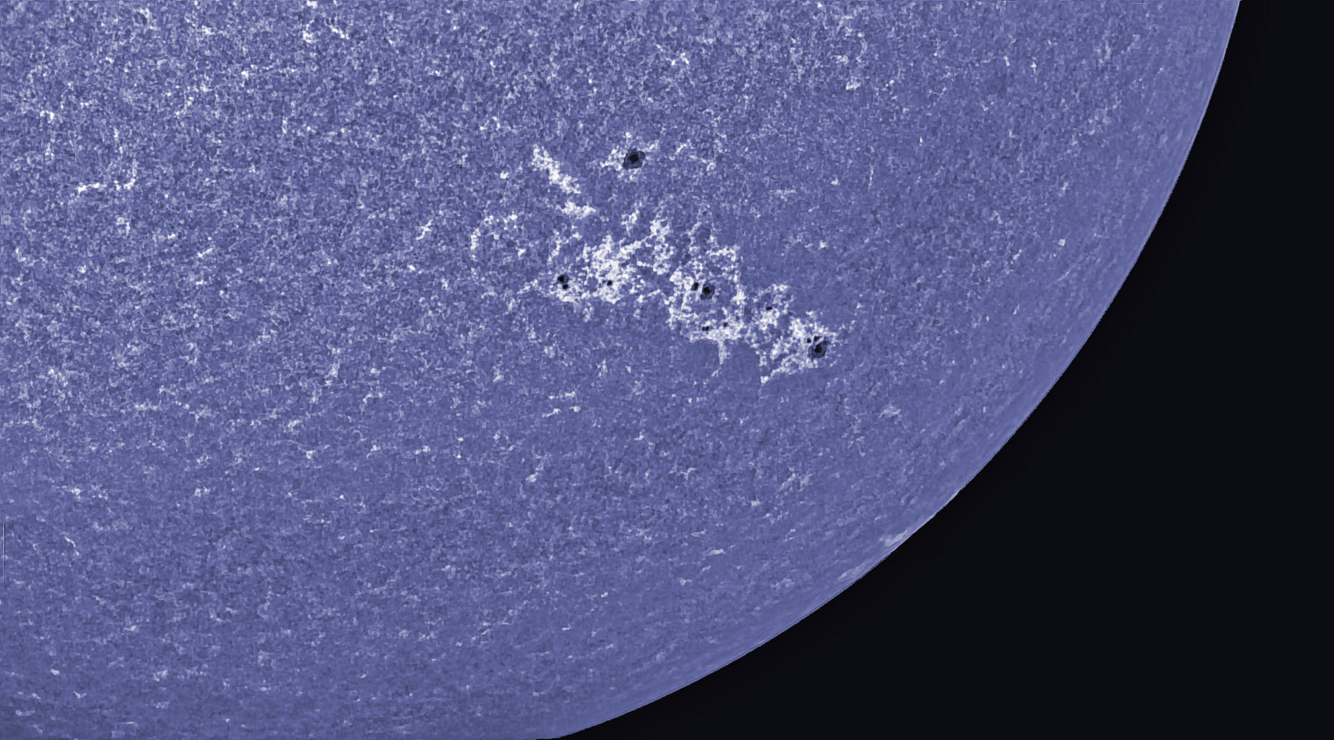Die kleine Fleckengruppe, die langsam über die südliche Oberfläche wandert, nähert sich dem östlichen Sonnenrand. Besonders gut kommen die Flecken im Licht der K-Linie des Kalziums zur Geltung.