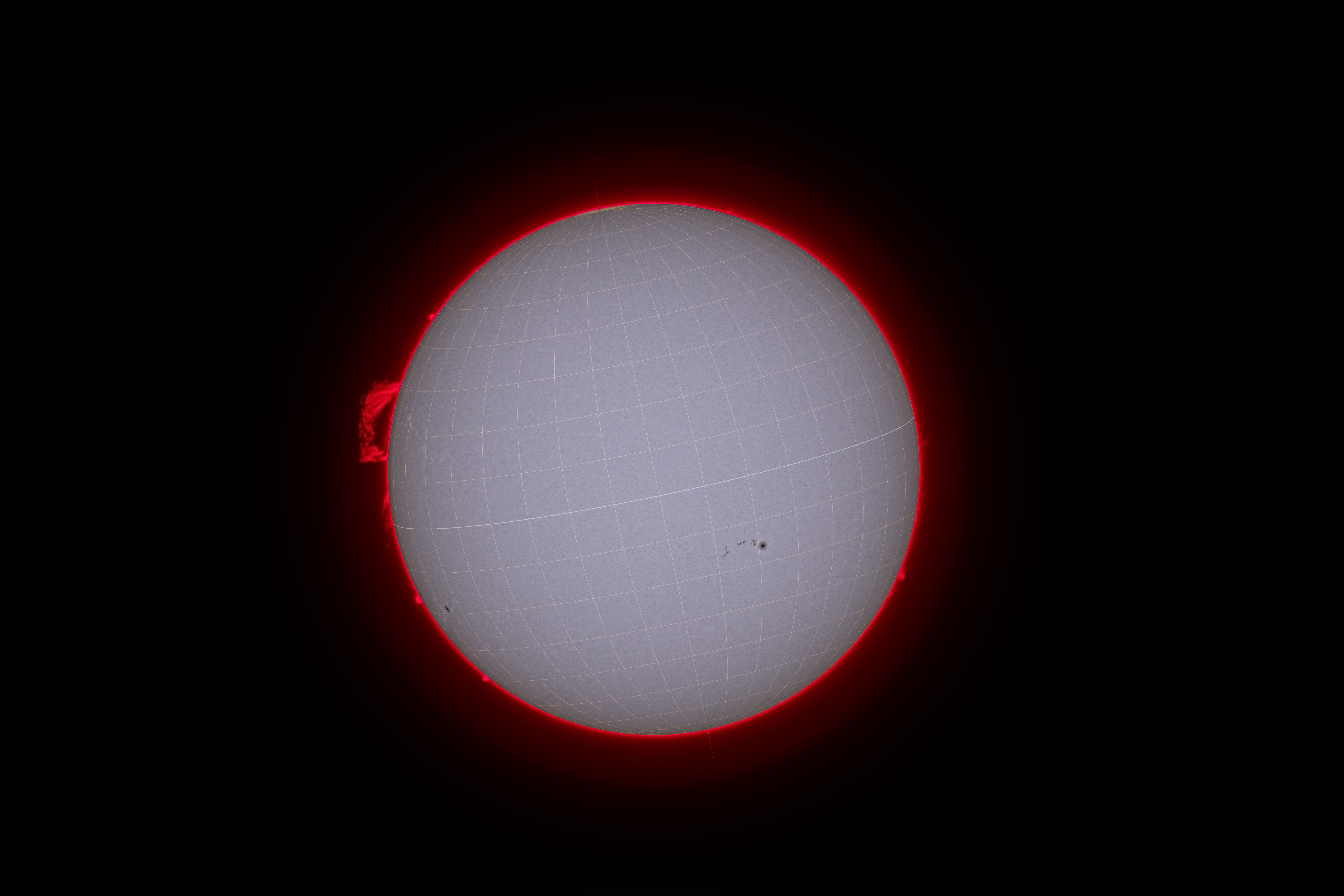 Die Sonne zeigte sich heute eindrucksvoll mit großer Protuberanz. Komposit aus einer Weisslicht- und einer H-Alpha-Aufnahme aus einem 4k-Film mit Daystar 60/930mm und einer Canon EOS R. Das Gradnetz wurde mit einer CAD-Software erzeugt.