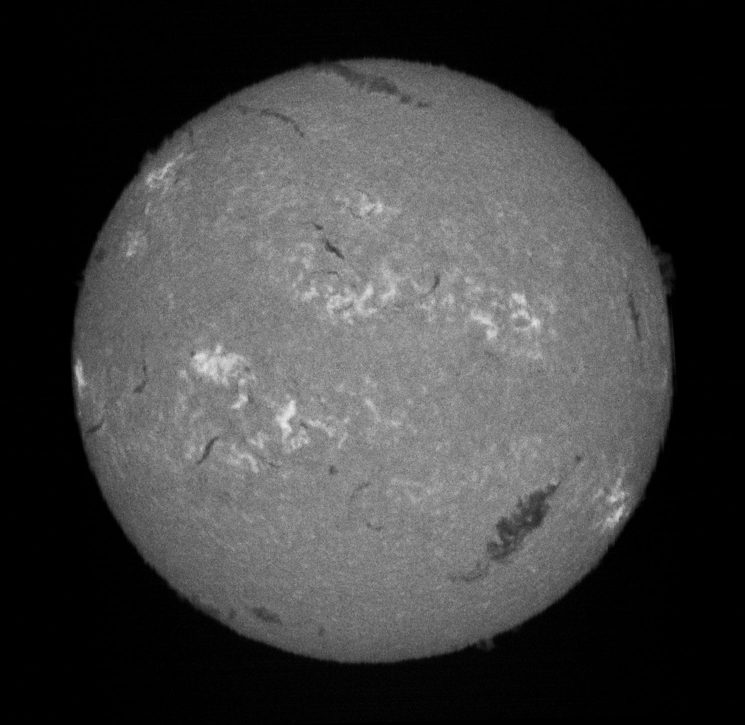 Am 4. Juni 2023 konnte ich erste Testaufnahmen der Sonne mit einem Do-It-Yourself Spektroheliographen Sol'EX aufnehmen. Bei den ersten Tests hatte ich die Baader Sonnenfilterfolie OD 3.8 vor dem Teleskop benutzt, diese schluckt jedoch zuviel Licht weswegen relativ lange Belichtungszeiten erforderlich waren. Bei dem Spektroheliographen wird jeweils ein Ausschnitt des Sonnenspektrums aufgenommen während sich die Sonne über das Bildfeld bewegt. Anschließend erfolgt dann die Rekonstruktion der Sonnenabbildung mittels der Software Inti. Es ist eine wesentlich engbandigere Filterung gegenüber klassischen Filtern möglich, allerdings ist es nicht so einfach gleichzeitig ein hohes Ortsauflösungsvermögen zu erhalten.