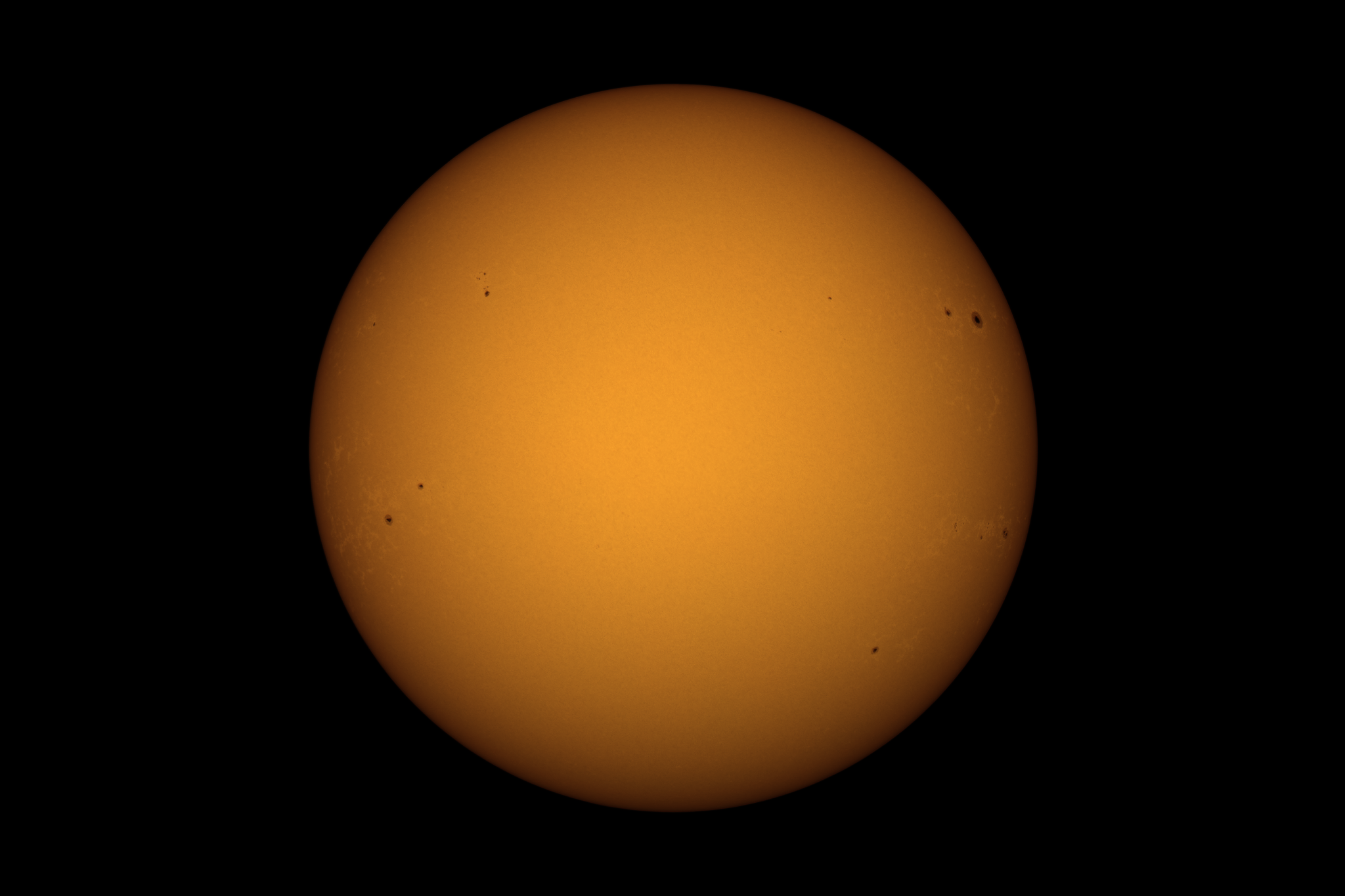 Die Sonne heute unter recht schlechten atmosphärischen Bedingungen. Seeing 3 bis 4, auch die Transparenz der Luft war unterdurchschnittlich. AR 3590 befindet sich nun wieder auf der Rückseite – ich denke aber, aufgrund seiner Größe dürfte er in etwas weniger als 14 Tagen wieder am Ostrand (links) auftauchen …