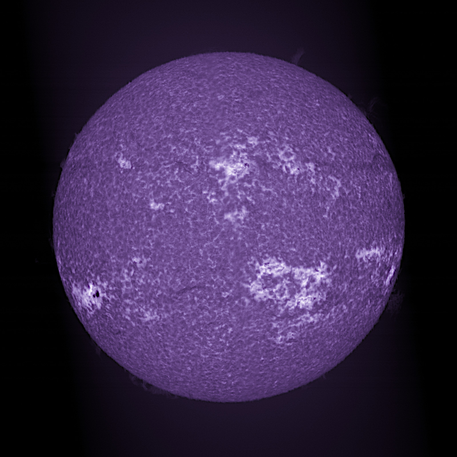 Am 8. Juli 2023 habe ich die Sonne mit dem von Christian Buil entwickelten Do-It-Yourself Spektroheliografen Sol'Ex im Kalzium-Bereich bei 393,4 nm aufgenommen. Als Teleskop kam ein Skywatcher 80/400 Refraktor zum Einsatz der auf 40 mm abgeblendet worden war. Vor dem Objektiv befand sich zudem noch ein ND 0.9 Filter von Baader um keine zu große Hitzeentwicklung am Eintrittsspalt des Spektrographen zu haben. Bei dem Spektroheliografen wird jeweils ein kleiner Ausschnitt des Sonnenspektrums aufgenommen während sich die Sonne über das Bildfeld bewegt. Anschließend erfolgt dann die Rekonstruktion der Sonnenabbildung mittels einer speziellen Software (SHG_Main_v3.8) die frei erhältlich ist:
