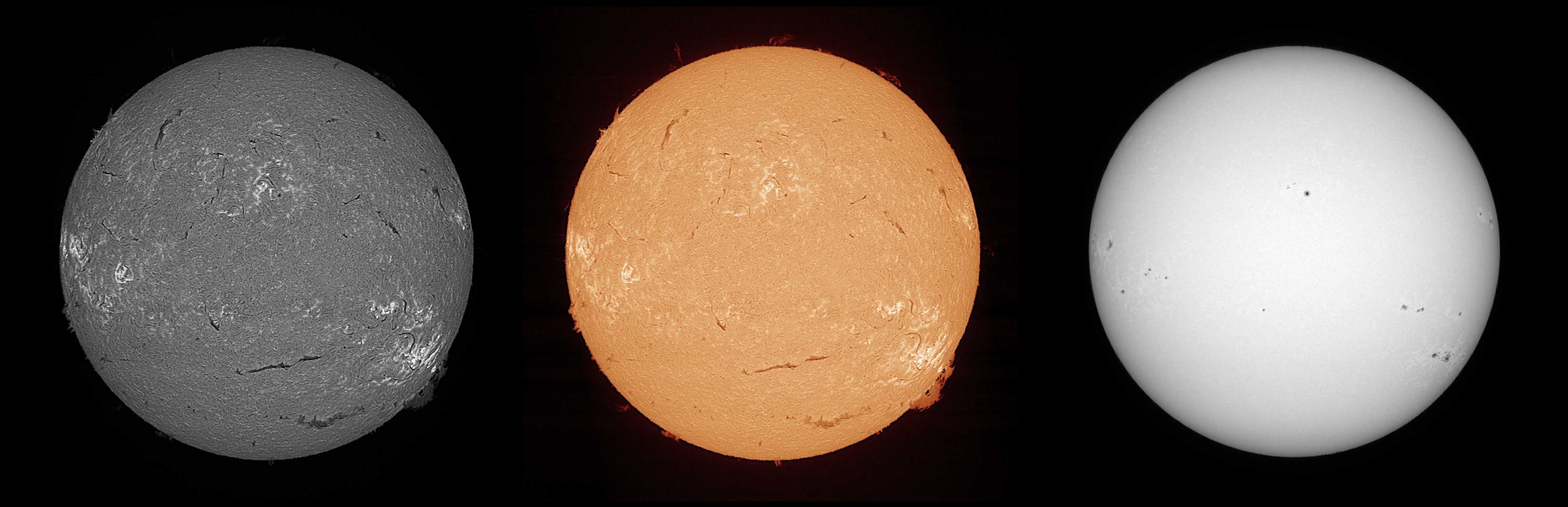 Am 8. Juni 2024 habe ich die Sonne mit dem von Christian Buil entwickelten Do-It-Yourself Spektroheliografen Sol'Ex im H-alpha-Bereich aufgenommen. Als Teleskop kam ein Skywatcher 80/400 Refraktor zum Einsatz der auf 40mm abgeblendet worden war. Vor dem Objektiv befand sich zudem noch ein ND 0.9 Filter von Baader um keine zu große Hitzeentwicklung am Eintrittsspalt des Spektrographen zu haben. Bei dem Spektroheliografen wird jeweils ein kleiner Ausschnitt des Sonnenspektrums aufgenommen während sich die Sonne über das Bildfeld bewegt. Anschließend erfolgt dann die Rekonstruktion der Sonnenabbildung mittels einer speziellen Software (SHG_Main_v4.3) die frei erhältlich ist: https://github.com/thelondonsmiths/Solex_ser_recon_EN/releases Es ist auf allen drei Bildern exakt der gleiche Bereich der Sonne aus der gleichen Messung dargestellt. Ganz links der H-alpha-Bereich (656.3nm) in Schwarzweiß mit einer kontrastreichen Oberfläche und in der Mitte eine etwas heller bearbeitete und eingefärbte Variante bei der die Protuberanzen besser erkennbar sind. Rechts befindet sich die Kontinuumsabbildung die aus der gleichen Messung mit einer minimal anderen Wellenlänge gewonnen worden ist.Um mögliche Artefakte und das Bildrauschen weiter zu reduzieren, wurde über 9 Scans (Aufnahmezeit zwischen 08:16 Uhr und 08:25 Uhr) gemittelt.