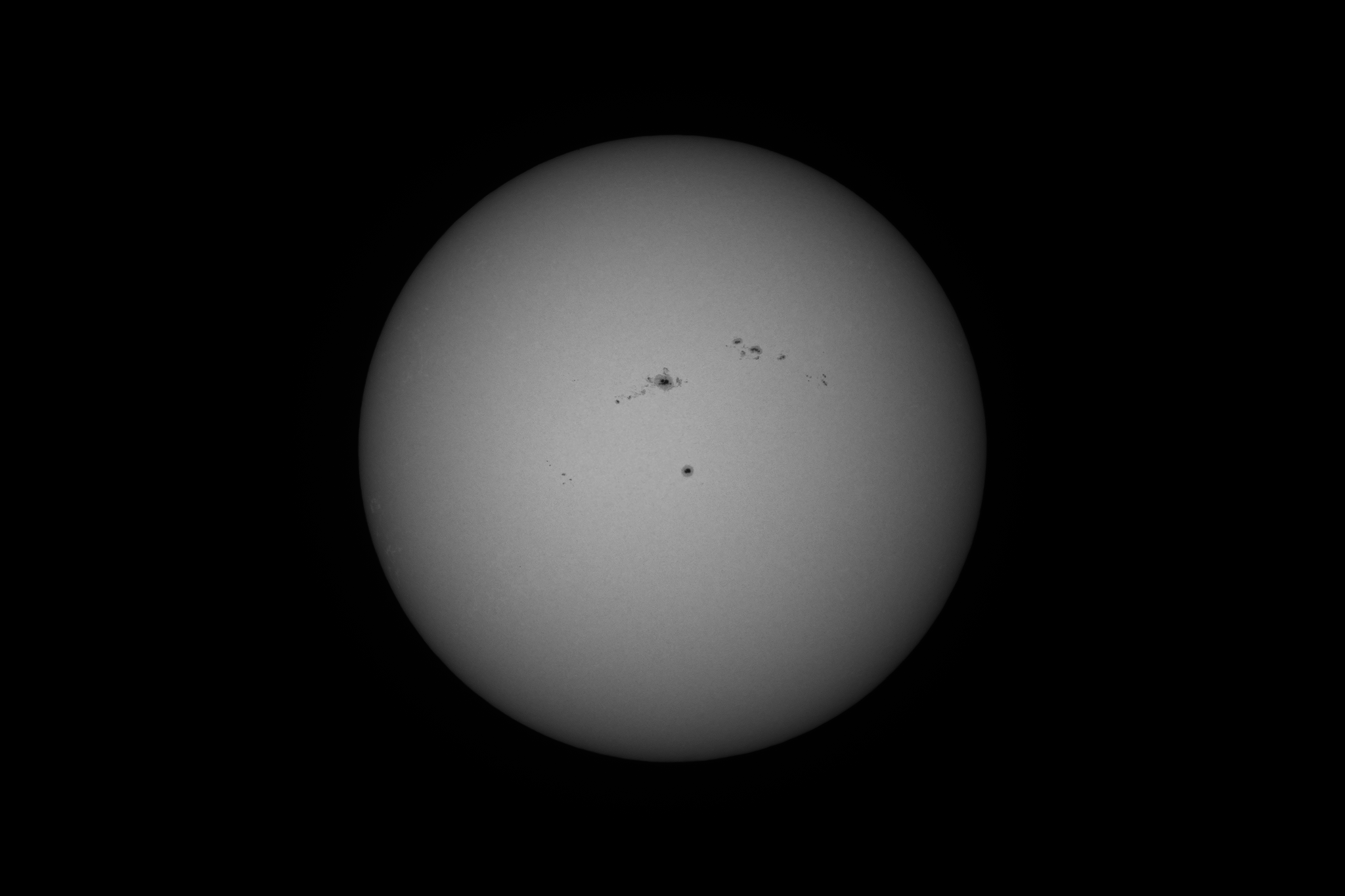 Die Sonne heute unter miserablen atmosphärischen Bedingungen. Entgegen der Vorhersage dichte Schleierwolken, durch die ich fotografieren musste, um wenigstens einmal die Flecken der jetzigen Aktivität zu erwischen. Wolkenfreier Himmel nur 10 km entfernt. Wettervorhersage für Freital traf heute leider nicht richtig zu. Zudem sehr böiger Wind. Konnte nur in kurzen windschwachen Momenten auslösen.