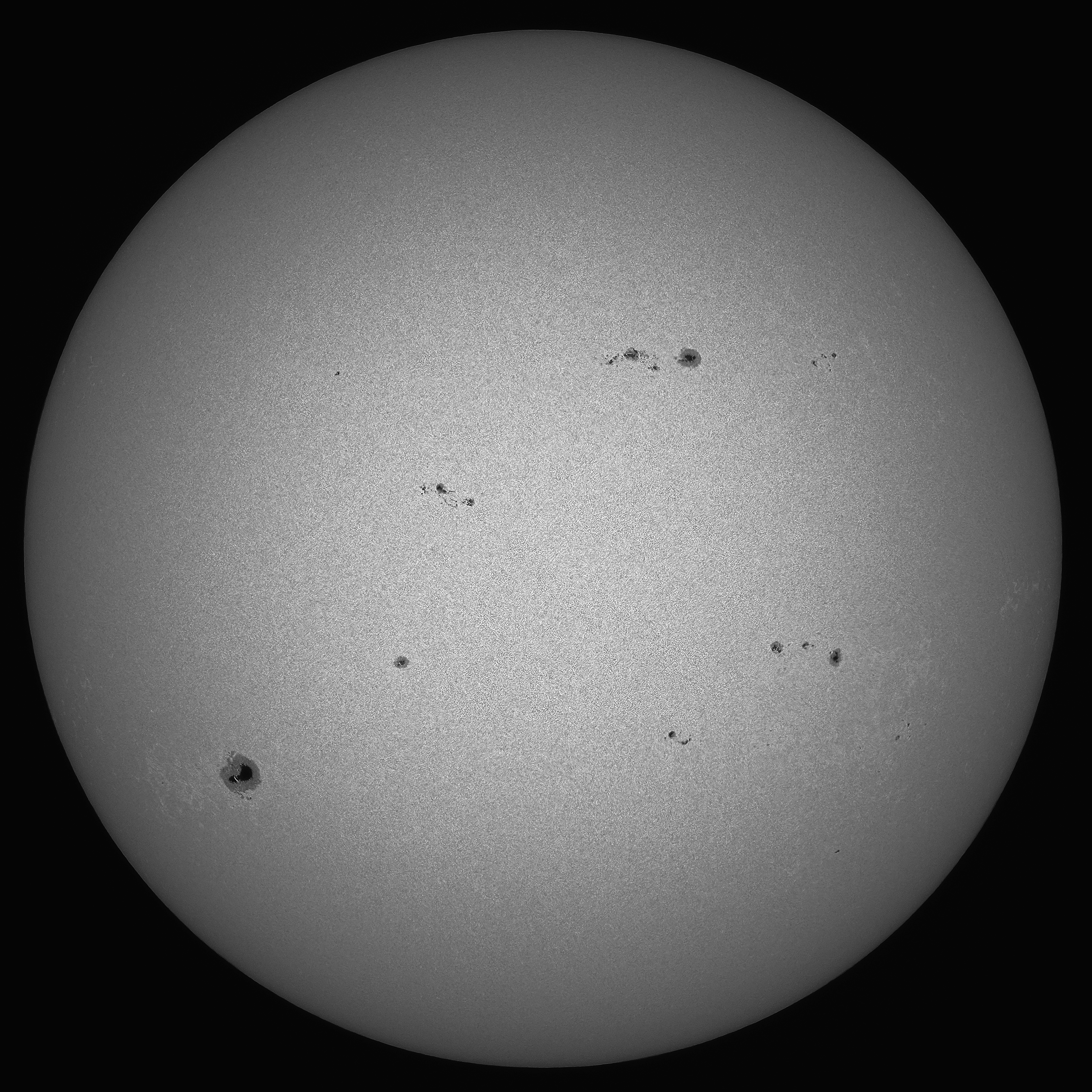 Gesamtsonne mit kleinen und großen Sonnenflecken, die Größte ist die AR 13363. Sehr schön zu sehen ist auch die zunehmende Randverdunkelung der Sonnenscheibe.