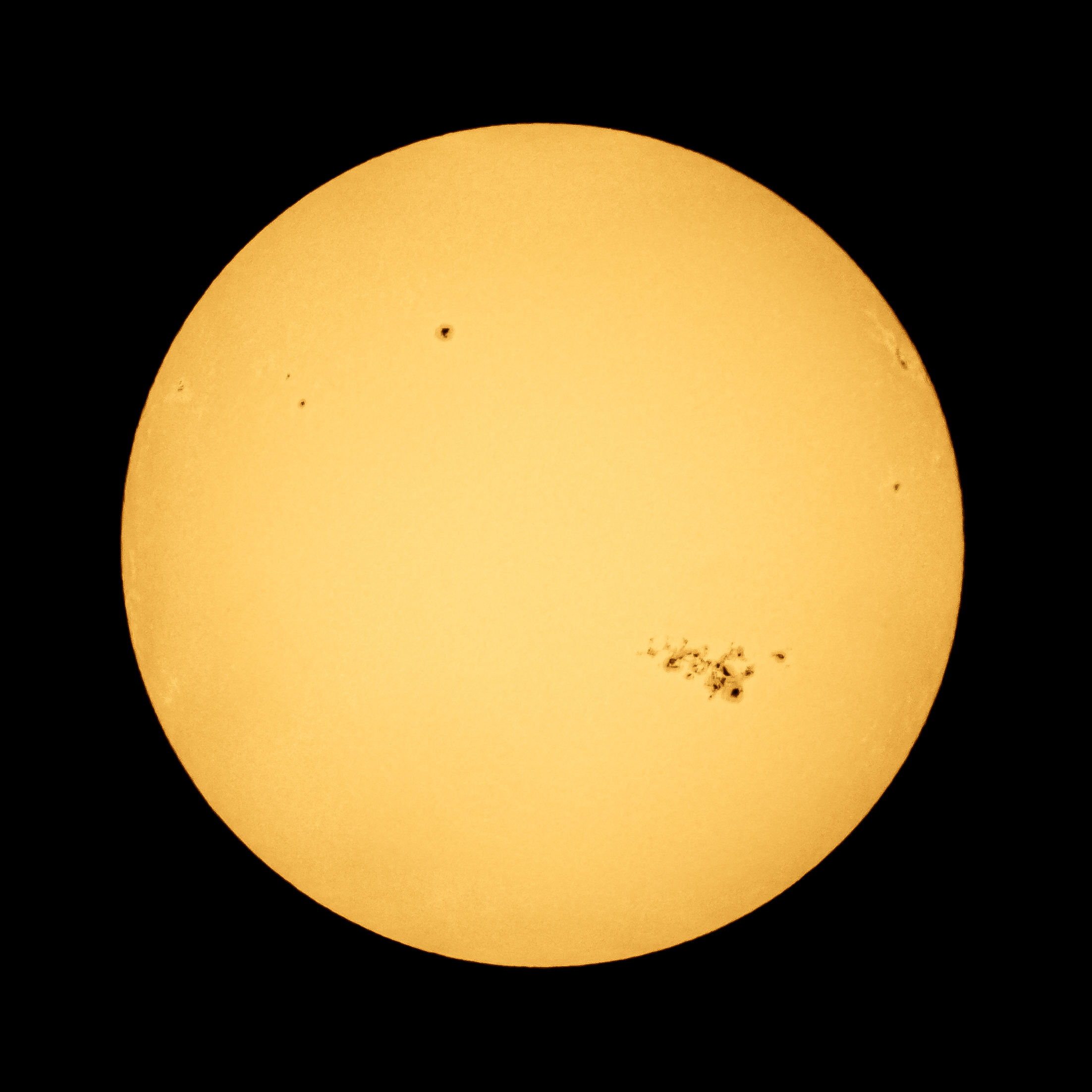 Einzelbild der Sonne am heutigen Feiertag mit den sehr großen Fleckengruppen AR 3664/3668. Freihand (aufgestützt) mit Teleobjektiv durch Sonnenfilterfolie, die eigentlich für meinen 6-Zoll-Refraktor gedacht ist, hindurch fotografiert. Nachträglich wieder gelb eingefärbt.