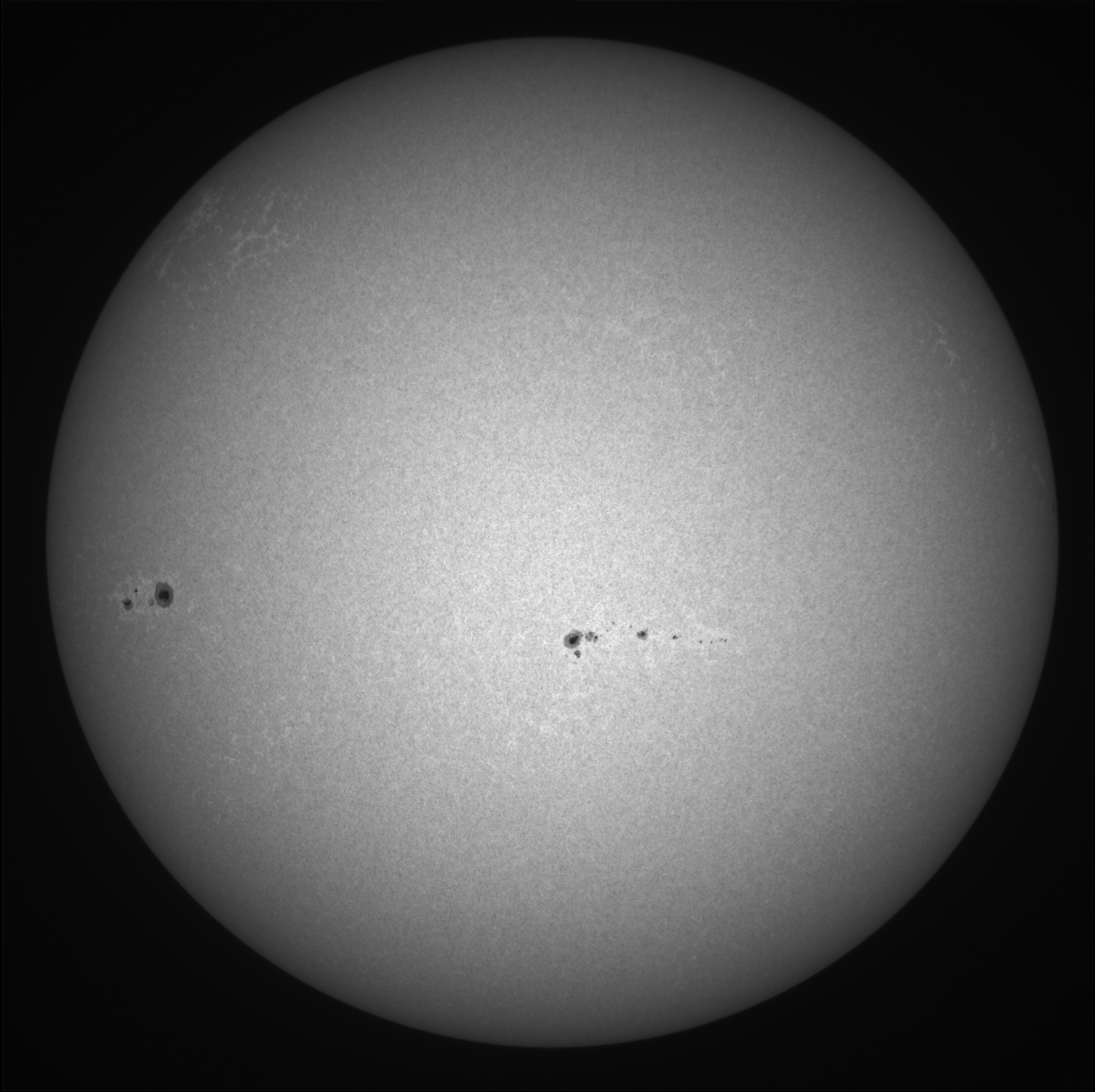 Aufnahme der Sonne mit Baader-Sonnenfilterfolie und Baader Venus UV-Filter mit Durchlassbereich bei 350 nm Wellenlänge (Bandbreite 60 nm). Im UV-Bereich wird der Kontrast der Sonnenoberfläche deutlich verstärkt gegenüber einer einfachen Weißlichtaufnahme.