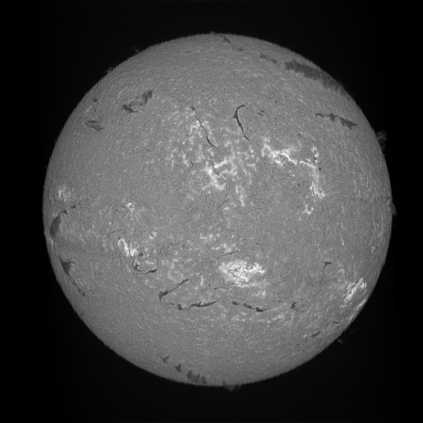 Am 11. Juni 2023 habe ich die Sonne mit dem von Christian Buil entwickelten Do-It-Yourself Spektroheliografen Sol'Ex aufgenommen. Als Teleskop kam ein Skywatcher 80/400 Refraktor zum Einsatz der auf 40mm abgeblendet worden war. Vor dem Objektiv befand sich zudem noch ein ND 0.9 Filter von Baader um keine zu große Hitzeentwicklung am Eintrittsspalt des Spektrographen zu haben. Bei dem Spektroheliografen wird jeweils ein kleiner Ausschnitt des Sonnenspektrums aufgenommen während sich die Sonne über das Bildfeld bewegt. Anschließend erfolgt dann die Rekonstruktion der Sonnenabbildung mittels der Software INTI. Die Aufnahme der Sonne erfolgte bei einer Wellenlänge von 656,3 Nanometern. Um das Rauschen noch etwas zu minimieren habe ich 3 Scans der Sonne aufgenommen und mit Autostakkert gestackt und mit Registax etwas nachgeschärft.