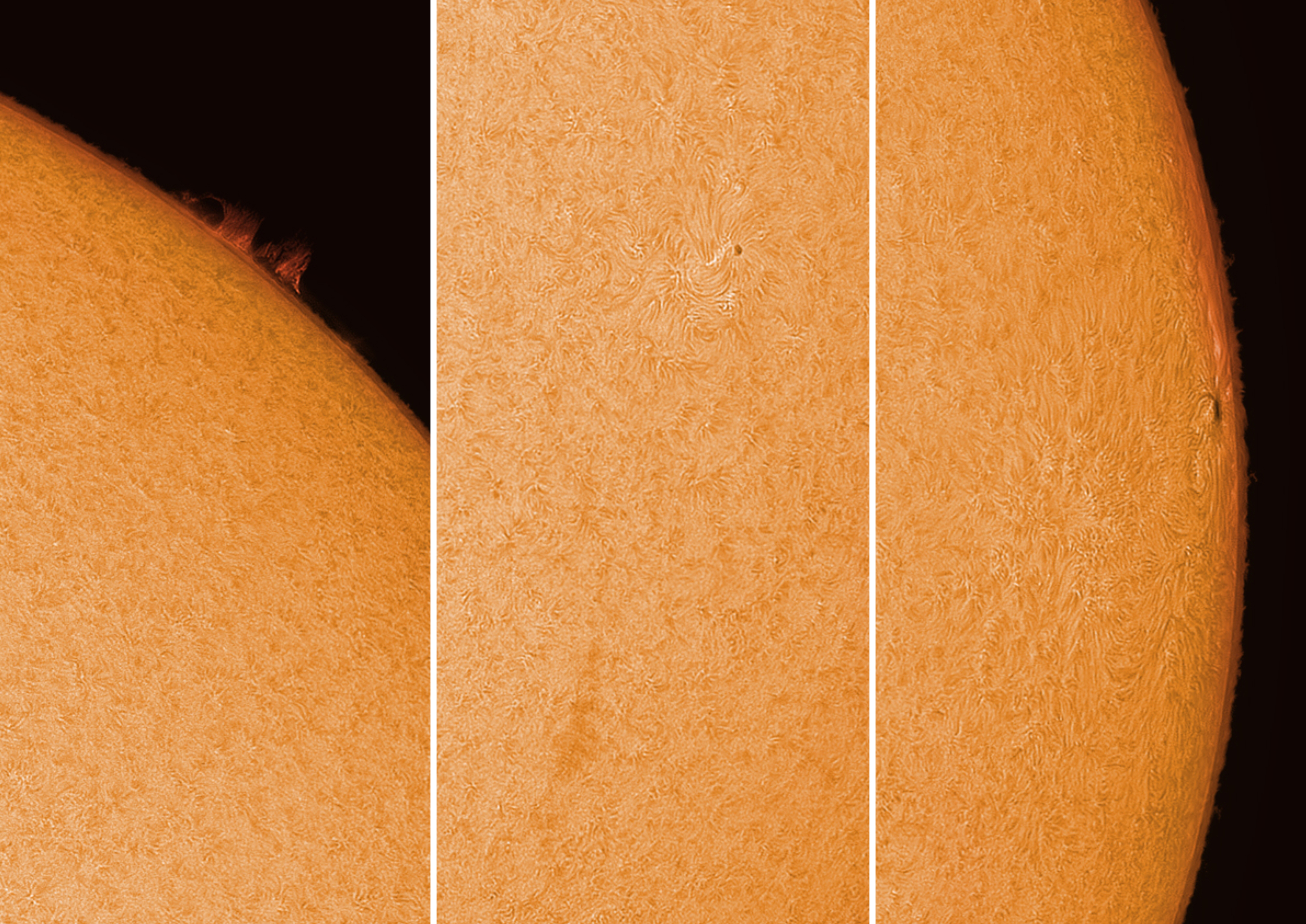 Am Karfreitag nahm ich diese hochauflösenden Bilder der Sonne im H-Alpha-Licht auf. Sie zeigen die Sonnenoberfläche, zwei Sonnenfleckenregionen (AR 2738 und AR 2739) und eine größere Protuberanz am Sonnenrand. Die Farbdarstellungen ist koloriert, um den Eindruck des sichtbaren Lichts zu simulieren.