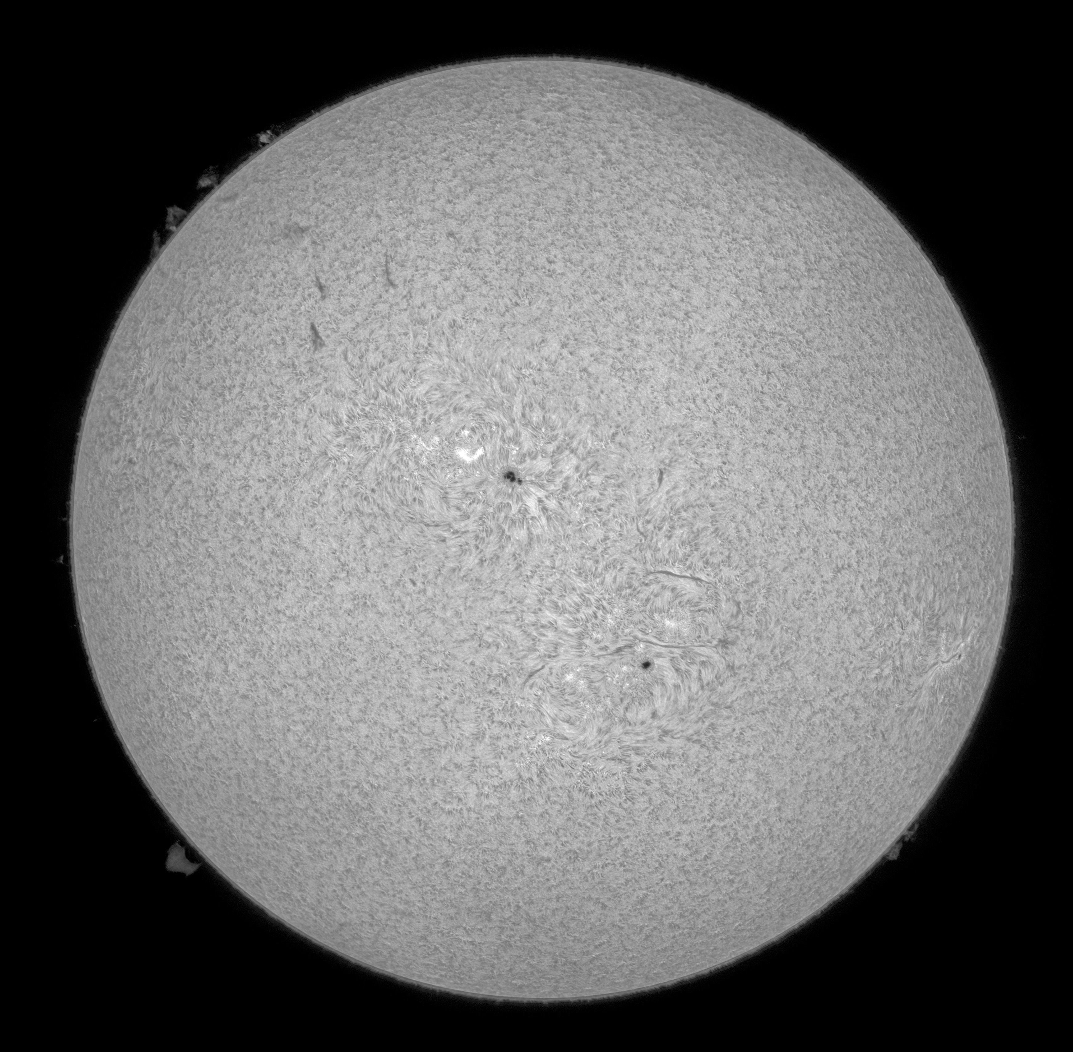 Zwischen zwei Regentagen wurde noch einmal das schöne Wetter genutzt, um "unseren" Stern im H-Alpha-Licht zu fotografieren. Es zeigten sich drei Sonnenflecken und einige Protuberanzen am Sonnenrand. Man merkt schon, dass es langsam in Richtung des Winters geht und die Sonne nicht mehr so hoch am Himmel steht.