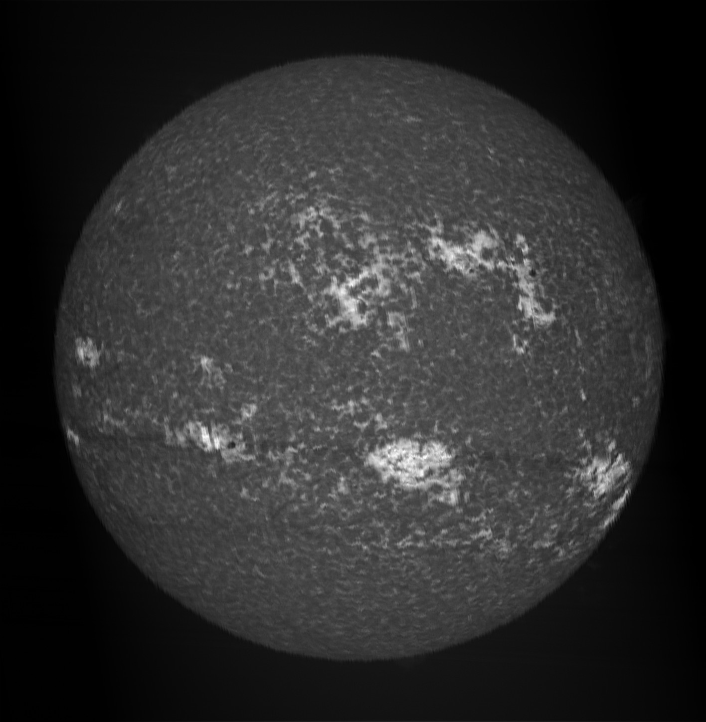 Am 11. Juni 2023 habe ich die Sonne mit dem von Christian Buil entwickelten Do-It-Yourself Spektroheliografen Sol'Ex aufgenommen. Als Teleskop kam ein Skywatcher 80/400 Refraktor zum Einsatz, der auf 40mm abgeblendet worden war. Vor dem Objektiv befand sich zudem noch ein ND 0.9 Filter von Baader um keine zu große Hitzeentwicklung am Eintrittsspalt des Spektrographen zu haben. Bei dem Spektroheliographen wird jeweils ein kleiner Ausschnitt des Sonnenspektrums aufgenommen während sich die Sonne über das Bildfeld bewegt. Anschließend erfolgt dann die Rekonstruktion der Sonnenabbildung mittels der Software INTI. Die Aufnahme der Sonne erfolgte bei der Ca K-Linie mit einer Wellenlänge von 393,4 Nanometern. Um das Rauschen noch etwas zu minimieren, habe ich drei Scans der Sonne aufgenommen und mit Autostakkert gestackt und mit Registax etwas nachgeschärft.
