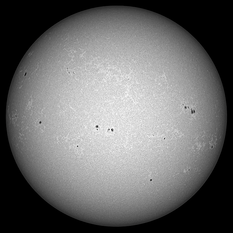 Auch mit einem Refraktor und einer Nichtastrokamera sind Aufnahmen der Sonne im nahen UV möglich. Der Pentax 125SDP Refraktor zeigt sich hier durchlässig genug, um im Zusammenspiel mit einer umgebauten Panasonic Lumix GH6 (Vollspektrumumbau) und einem Baader Calcium Filter (Gen II) die Sonne in eher ungewöhnlicher Ansicht festzuhalten. Ein Baader Solarfilter OD 3,8 wurde vorgeschaltet. Im April / Mai 2025 lockte die Sonne mit ihrer Aktivität und stetigen Veränderungen in verschiedenen Wellenlängen öfter an die Fernrohre und Kameras. Anbei eine Übersicht im Calciumlicht, welche eine vielfach mit Flecken besprenkelte Sonnenscheibe zeigt. Ein Stack aus einem Film mit 15 Sekunden Dauer bei 50 fps diente als Grundlage.