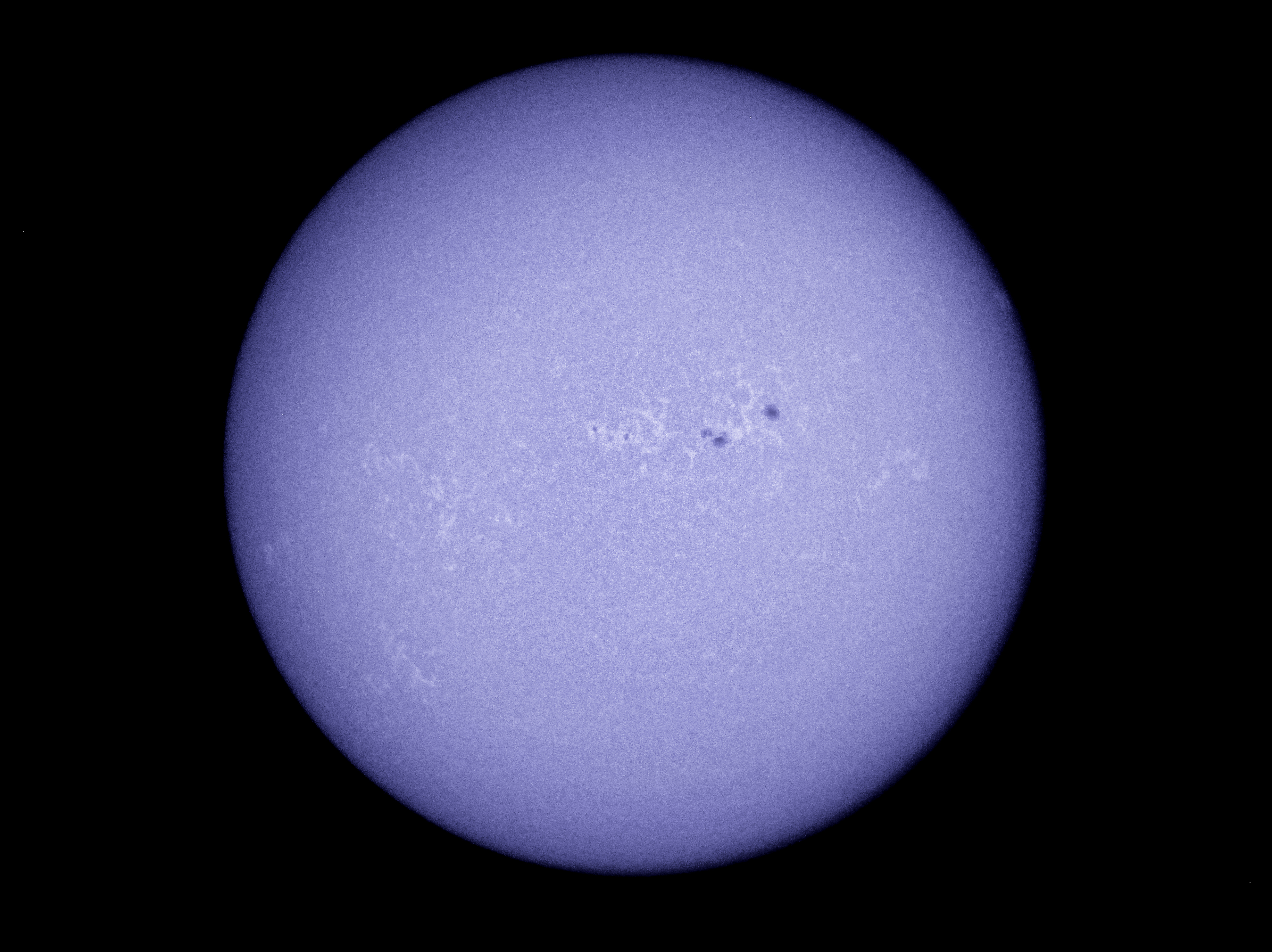 In der CaH-Linie sieht man die Sonnenflecken und die Fackelgebiete. Dass es auch komplexe Fackelgebiete unabhängig von Flecken gibt, ist auf dem Bild schön zu sehen.