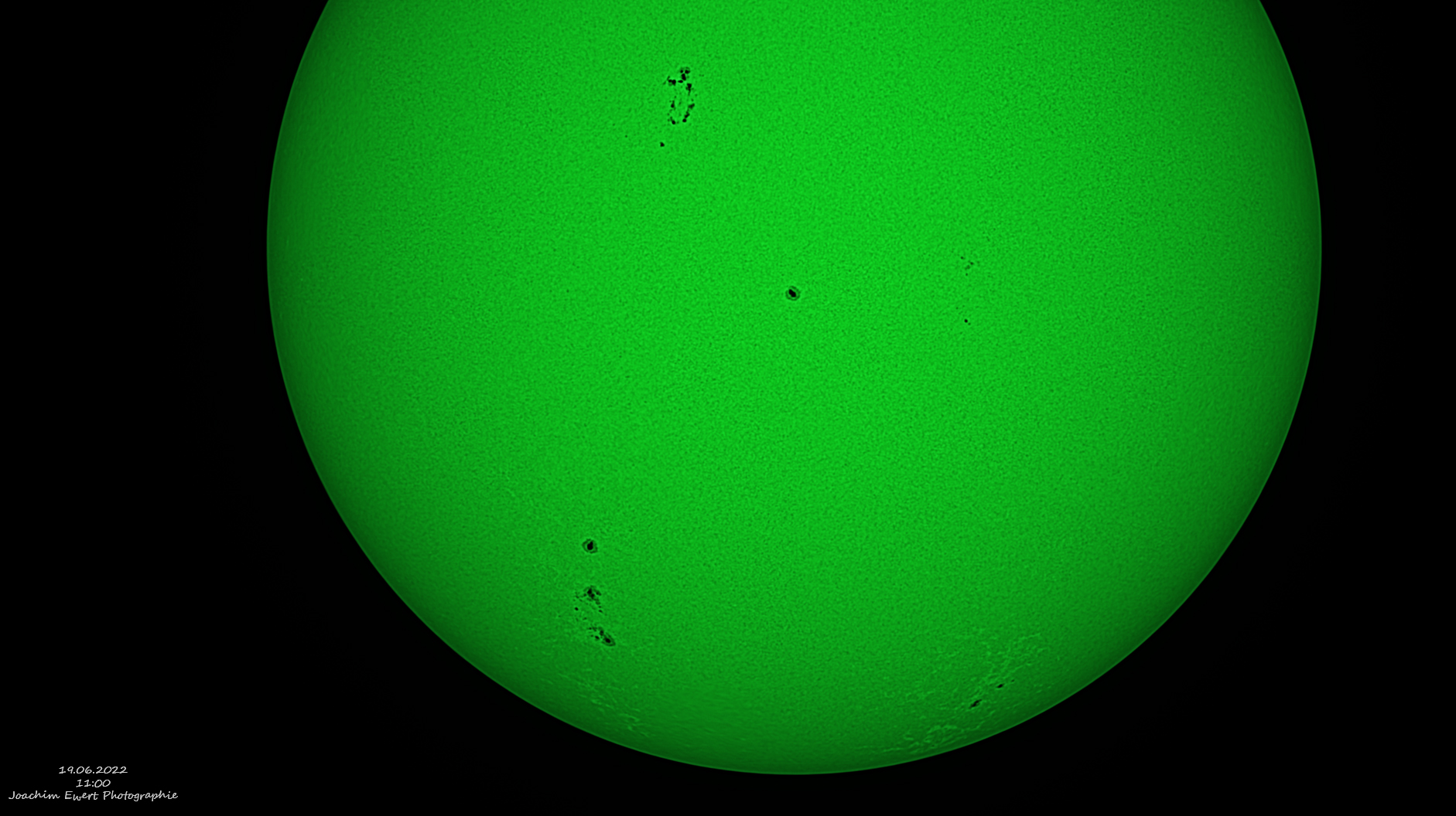Grüne Sonnen sieht man selten. Gestern war mal wieder ein guter Tag für die Beobachtung mit dem Herschelkeil. Sie hatte so um die 14 sichtbare Sonnenflecken.