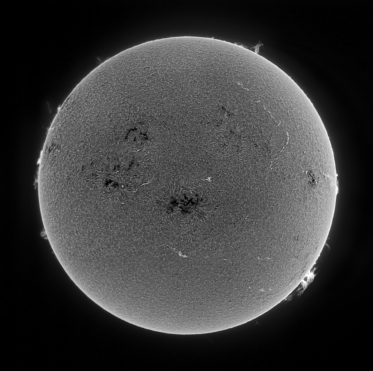 Angeregt durch Bilder anderer Amateure im Internet habe ich bei diesem Sonnenbild die Helligkeiten auf der Sonnenscheibe invertiert dargestellt, damit die Protuberanzen dort, wie auch am Rand, hell erscheinen. Die aktiven Gebiete sind damit nun dunkel. Sonnenscheibe und Protuberanzen wurden getrennt aufgenommen und später überlagert. Jedes Bild ist zudem ein Mosaik aus je zwei Aufnahmen. Die Verwendungsrate liegt bei 400 von 3000 Bildern für die Scheibe und bei 300 von 2000 Bildern für den Sonnenrand.