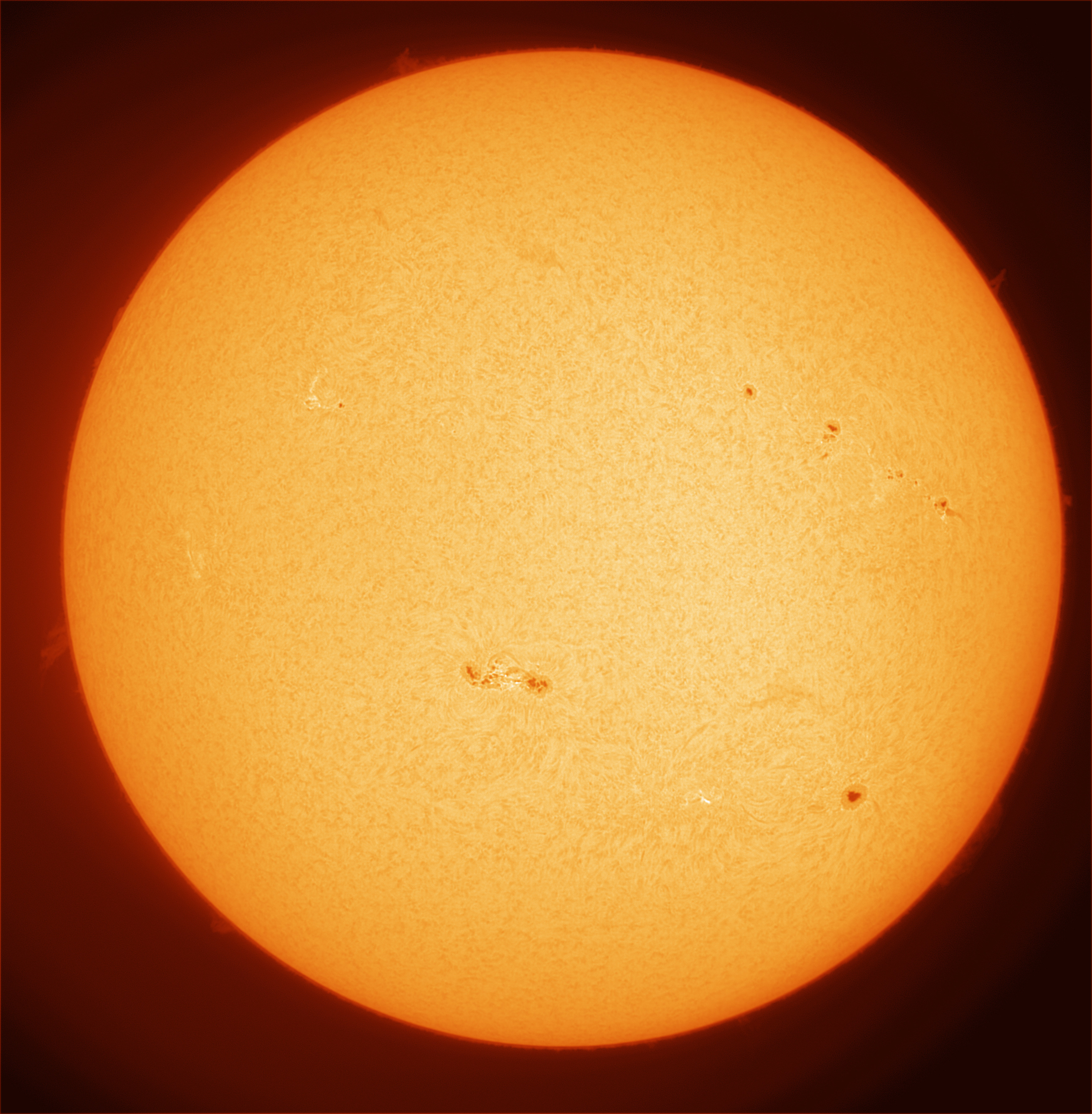 Einer meiner ersten Versuche die Sonne in H-Alpha aufzunehmen. Die gleichzeitige Sichtbarmachung der Oberflächendetails und der Protuberanzen finde ich noch etwas schwierig. Hier habe ich mich dafür entschieden auch die Protuberanzen zu sehen verliere dabei aber an Kontrast auf der Oberfläche.