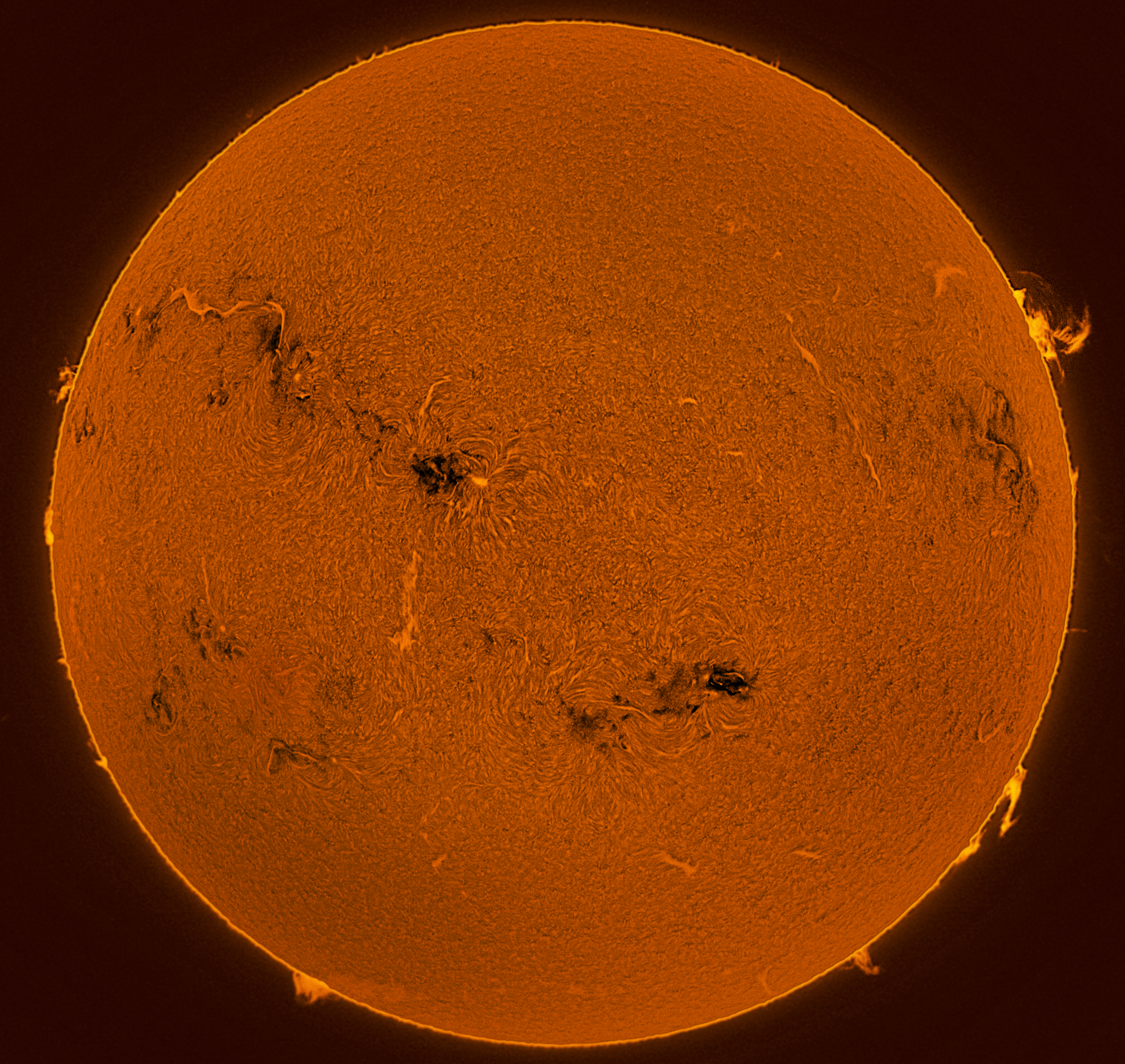 Die Sonne aufgenommen mit dem Lunt Double Stack 60 x 500 mm. Die Sonnenscheibe wurde invertiert bearbeitet. Das Bild entstand aus einer Aufnahmeserie mit 3000 Bildern. Die Ausleuchtung durch den Lunt-Kippfilter ist nicht optimal gleichmäßig und muss jeweils mit der Bearbeitung korrigiert werden.