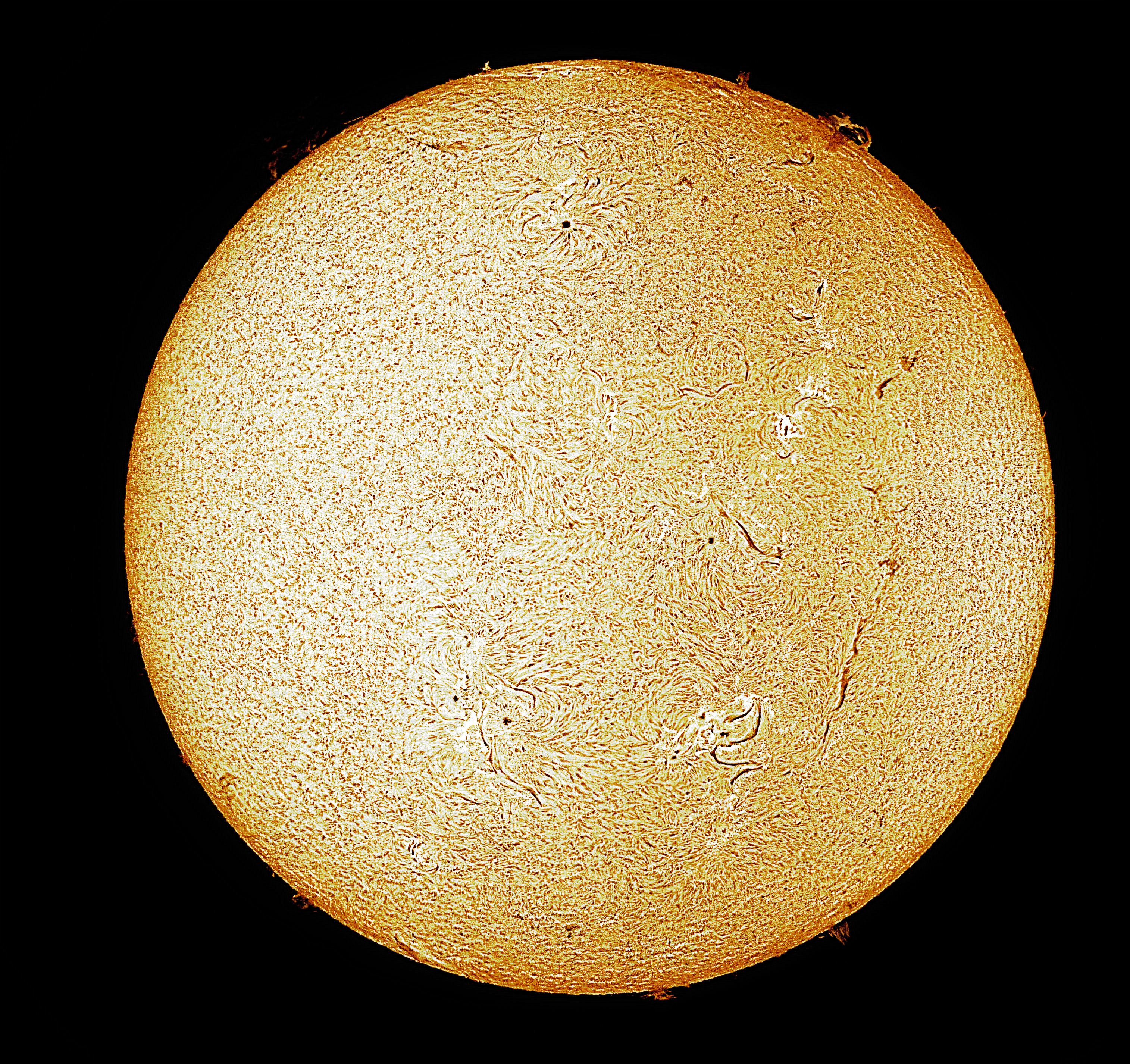 Jeder Sonnenschein wird »gnadenlos« ausgenutzt, um meinen Heliostar zu genießen. Hier habe ich mit der Asi 178 mm und ohne Barlow das für mich beste Ergebnis bei der noch tiefstehenden Sonne erzielen können. Anschließend habe ich das Bild im Zuge der Nachbearbeitung koloriert.
