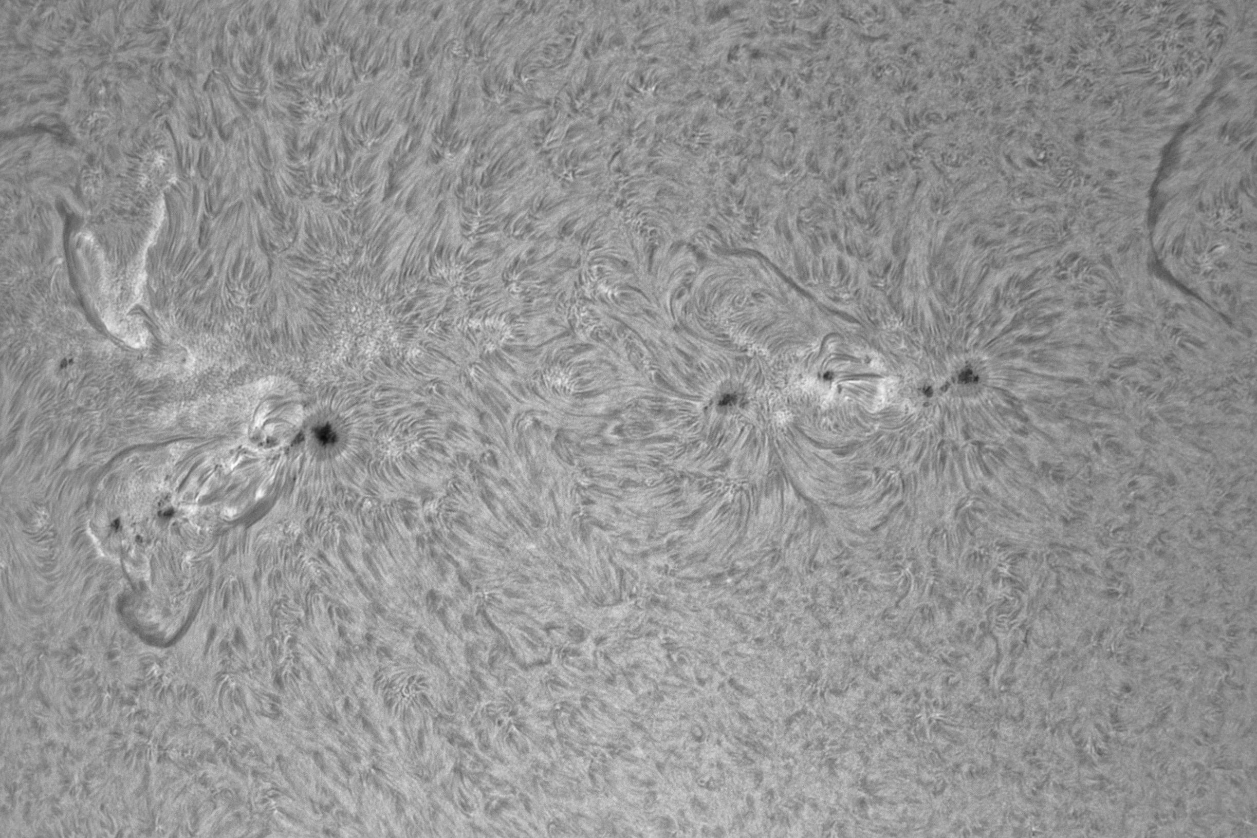 Die Sonne im H-Alpha-Licht zeigt die Regionen um die Sonnenfleckengruppen 3333 und 3335. Aufgenommen mit dem Sonnenteleskop des Vereins Sternwarte Trier e.V.