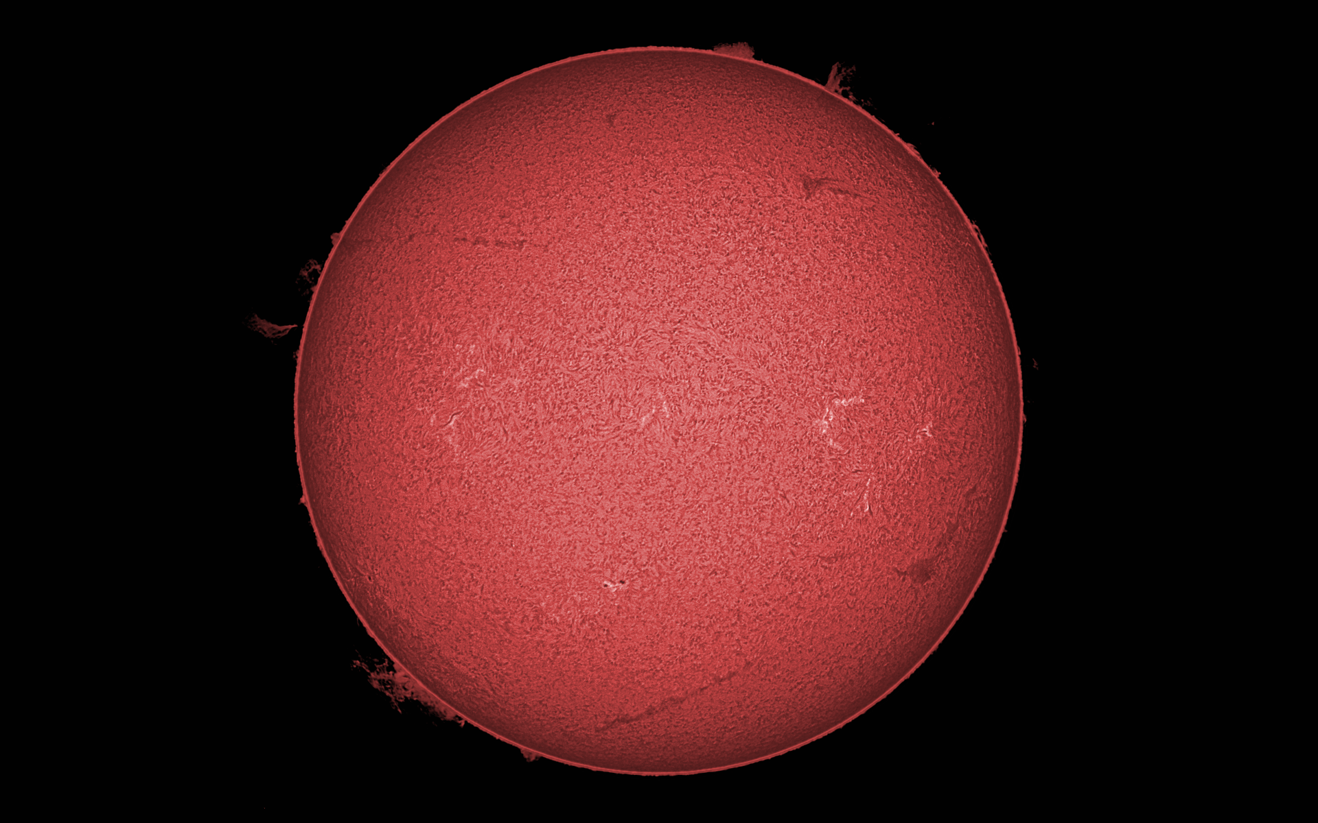 Die Sonne am 19. August 2025, aufgenommen im roten Licht des Wasserstoffs über einen Zeitraum von 6,5 Stunden. Deutlich sind die Rotation der Sonne sowie die zeitliche Veränderung der Protuberanzen am Sonnenrand zu erkennen.