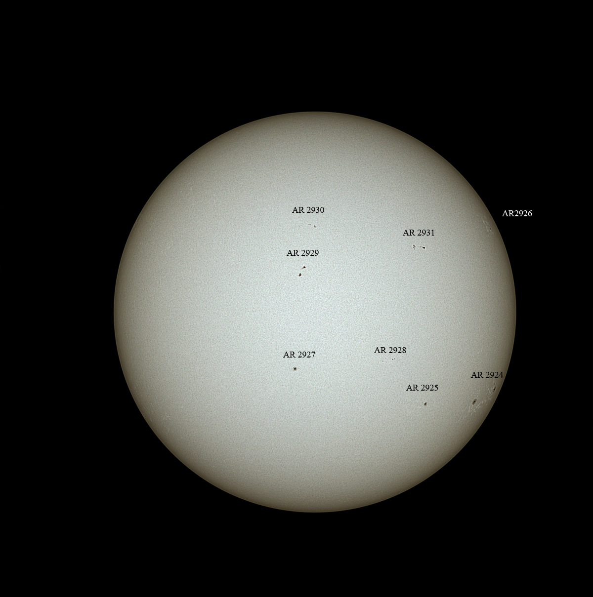 Die Sonne konnte heute mit sage und schreibe acht Fleckengruppen auf einmal gesehen werden - da bis zum Mittag die Wolken ausblieben, habe ich mir das nicht entgehen lassen zu fortografieren.