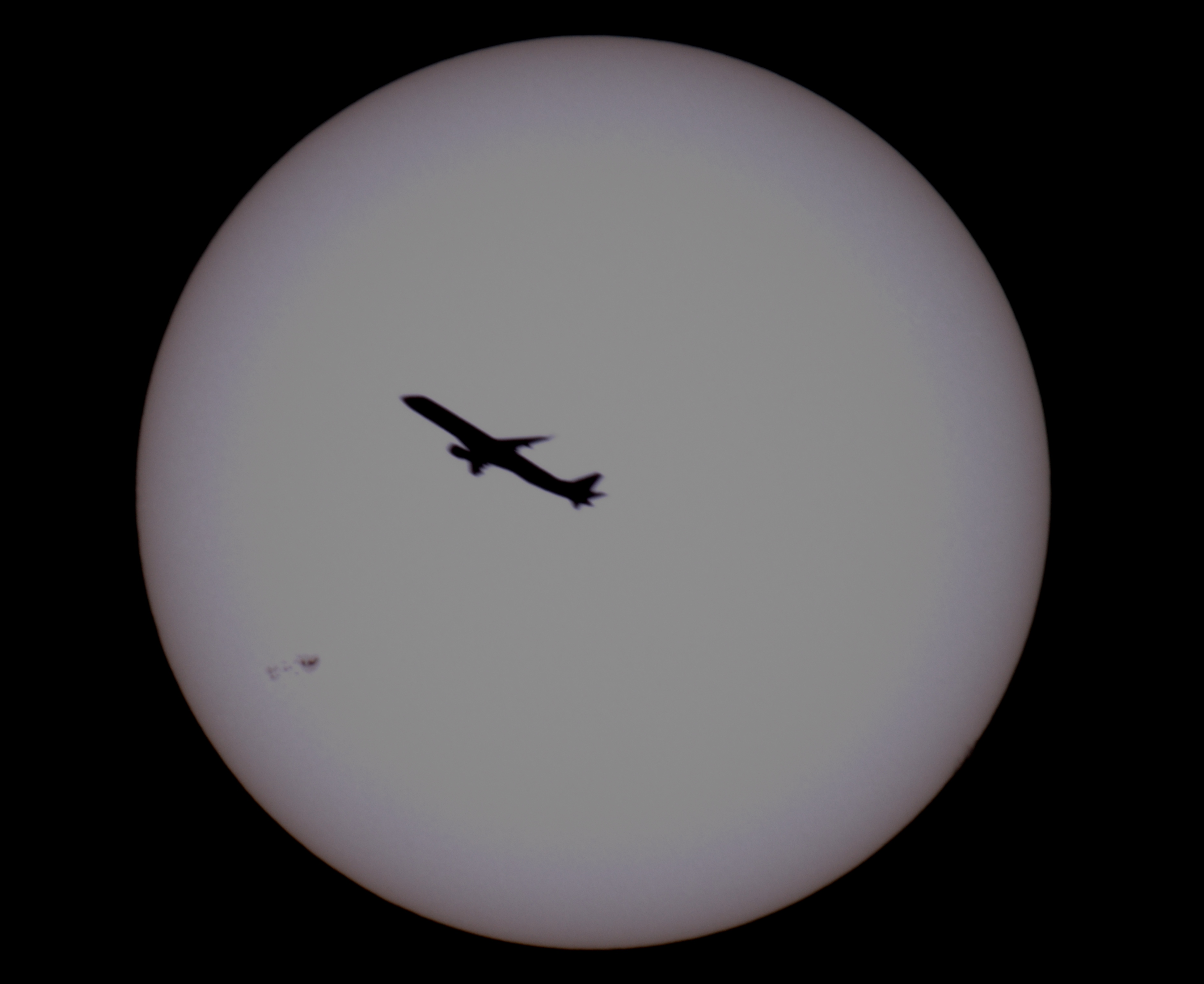 Beim Versuch, die ISS vor der Sonne zu fotografieren, war mir bei den ersten Testaufnahmen das Flugzeug, das wohl kurz zuvor am nahen Frankfurter Flughafen gestartet war, zufällig mit auf das Bild geraten.