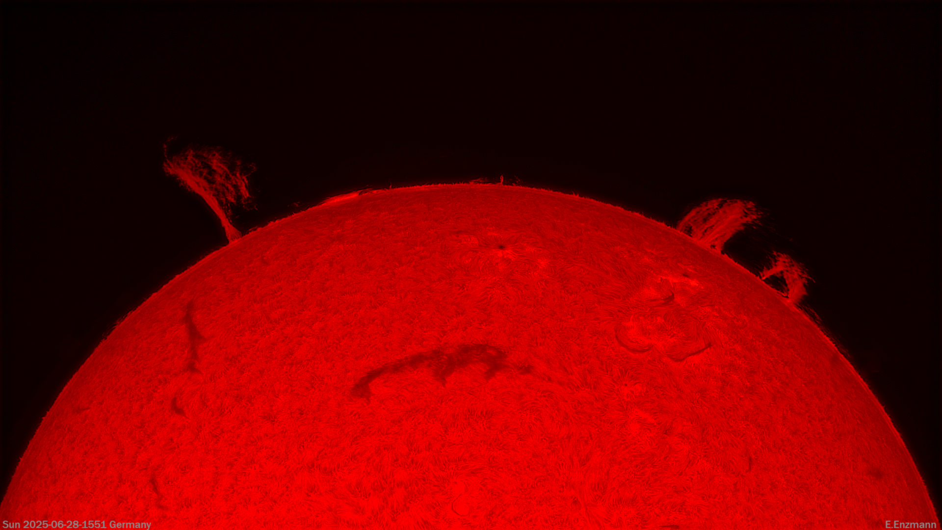 Heute, am 28. Juni 2025, waren drei große Protuberanzen am Rand der Sonne sichtbar. So prächtige habe ich schon lange nicht mehr gesehen. Leider war ich sehr spät dran mit der Aufnahme, und die ständig vorbeiziehenden Wolken haben die Sache nicht gerade erleichtert. Hier ist eine erste Übersichtsaufnahme. Ich habe die drei großen Protuberanzen mit dem großen Instrument bei hoher Vergrößerung aufgenommen und werde sie später veröffentlichen. Vielleicht ist auch ein Zeitraffervideo möglich. Diese Aufnahme wurde mit einem Zeiss APQ 100/640 mit Solarscope, 100-mm-Frontaletalon und selbstgebautem Sperrfilter gemacht.