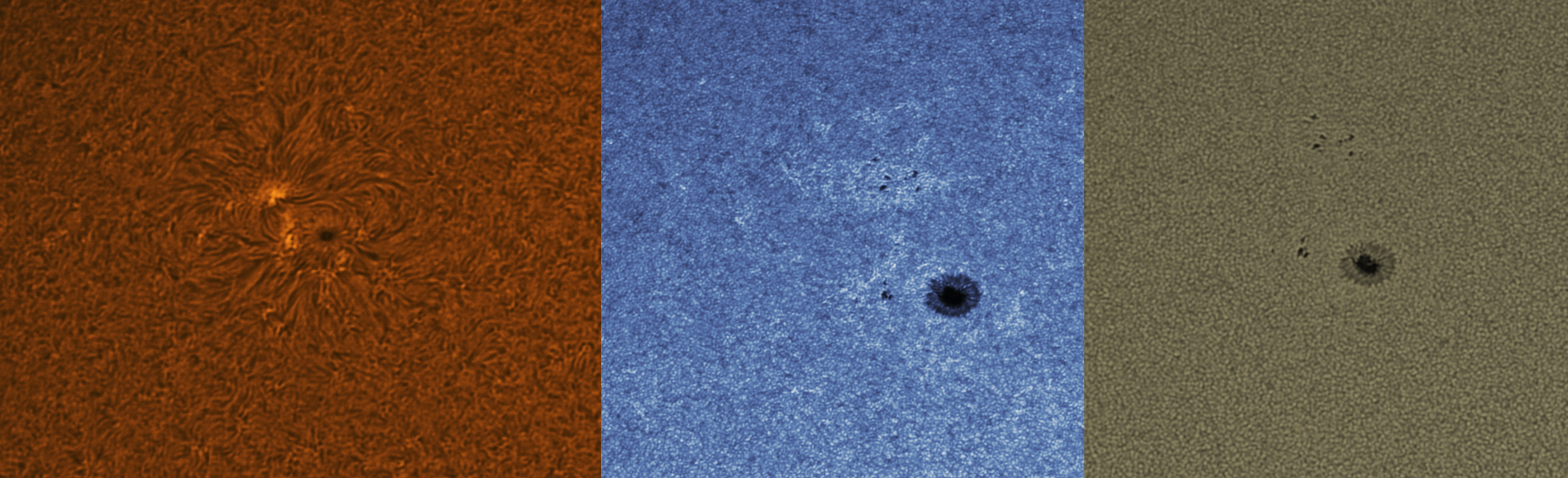 Filter: H-Alpha: (Lunt Solar Systems 60x 600 DS), Kalzium: (Baader Herschelprisma, 0.6ND- Filter,Baader K-Line HBW 390-398 nm, Weißlicht: (Baader Herschelprisma, Continuum, 0.9 ND-Filter). Jeweils die besten Bilder von 10000 gestackt.