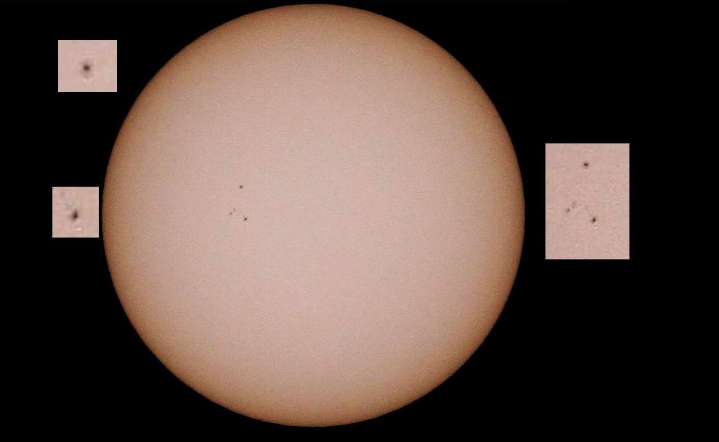 Samstagnachmittag, 16 Uhr, klare Sicht, keine Wolken. Kamera mit Sonnenfilter geholt und einige Bilder gemacht. Eine Fleckengruppe, die schon seit einigen Tagen sichtbar war, ist nun in der Mitte der Sonne zu sehen. Bei Sonnenaufnahmen immer Sonnenfilter benutzen.