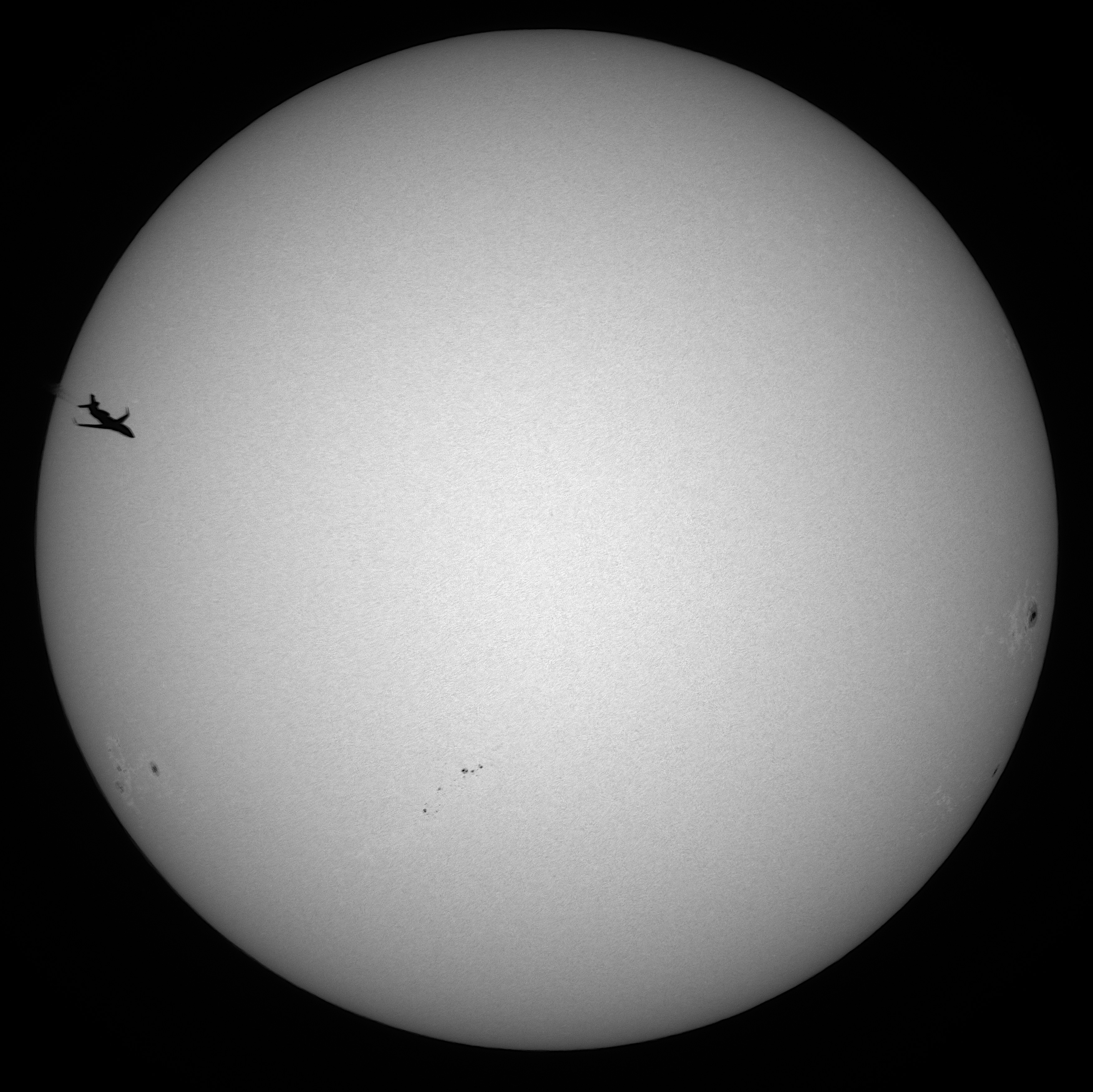 Am 9. Mai 2022 gab es im Weißlicht mit der Baader-Sonnenfilterfolie nur kleinere Sonnenflecken zu sehen, aber dann flog plötzlich ein Flugzeug vor der Sonne vorbei. Leider war meine Kamera zu langsam, um mehr als ein Bild mit Flugzeug aufzunehmen. Es handelt sich bei dem Bild um eine Einzelaufnahme!