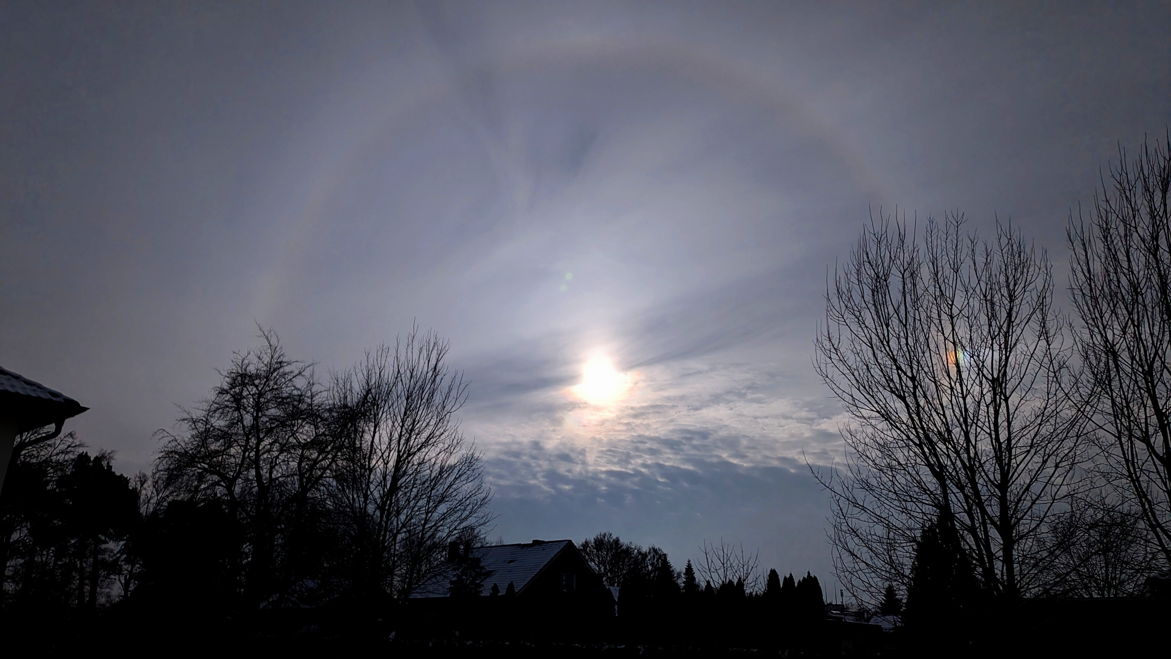 Mittags um 15 Uhr tauchte plötzlich dieser Halo auf. Die Nebensonne rechts blinkt durch die Bäume.