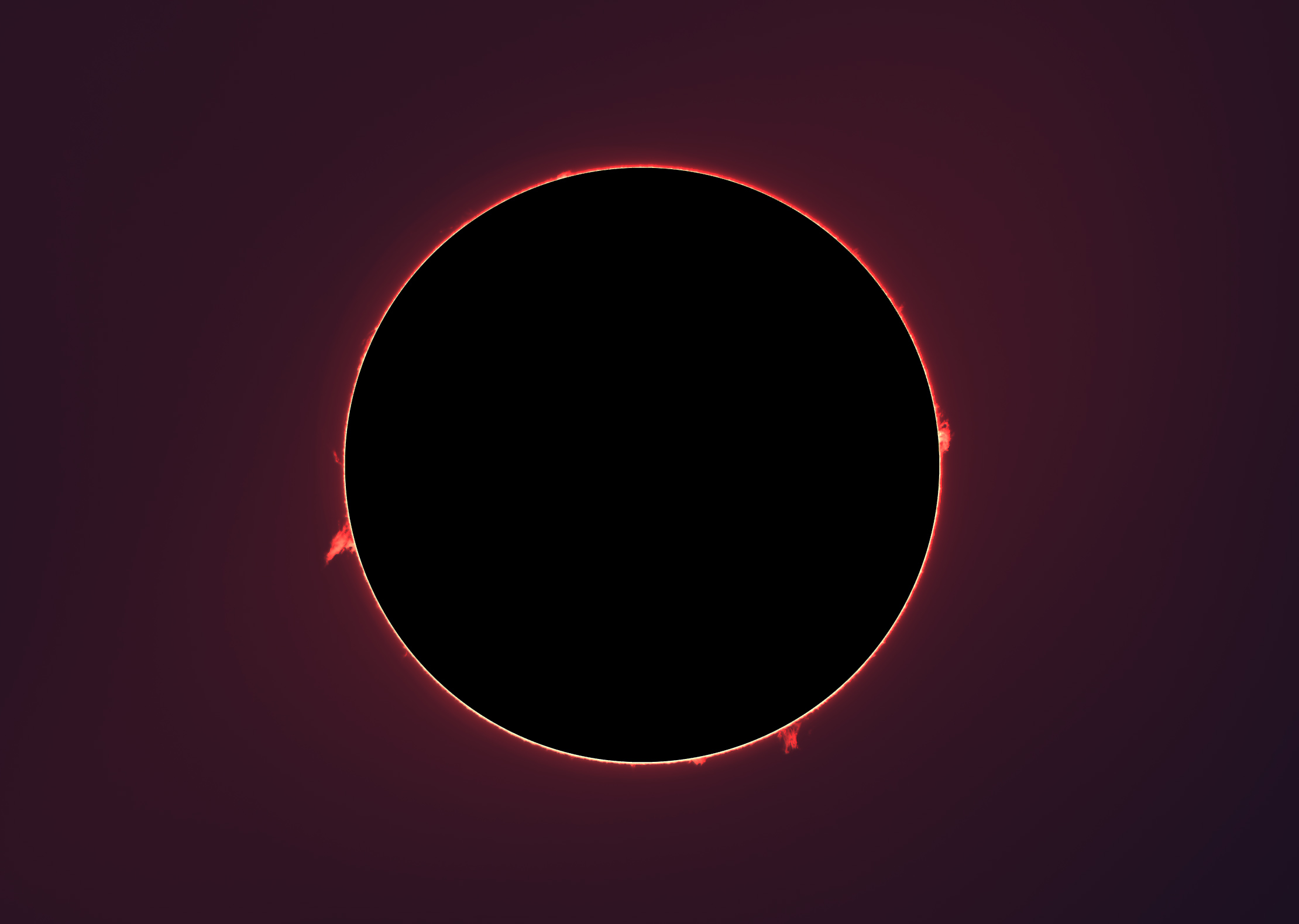 Diese »Photoshop-Sonnenfinsternis« zeigt die Protuberanzen am Sonnenrand. Die Oberfläche könnte sonst nur sehr überbelichtet dargestellt werden.