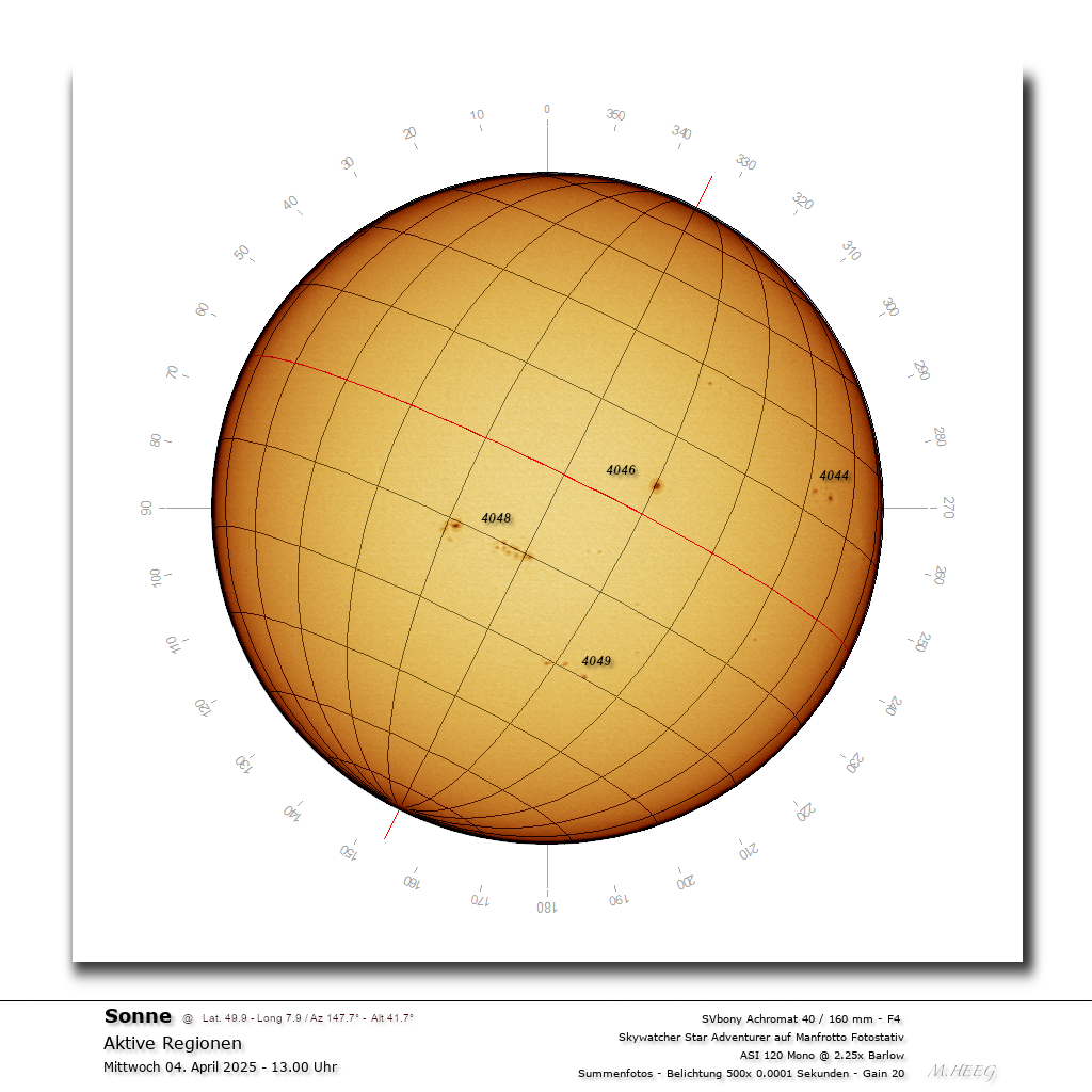 Auch mit sehr kleiner Ausrüstung kann man sich mit der Positionsbestimmung aktiver Regionen der Sonne beschäftigen. Auch mit solcher Ausrüstung sind schöne Beobachtungen / Auswertungen möglich. Entsprechende Infos sind in der Bildunterschrift zu finden. Viele Grüsse an alle Sonneninteressierten sendet Marco Heeg aus Bingen am Rhein.