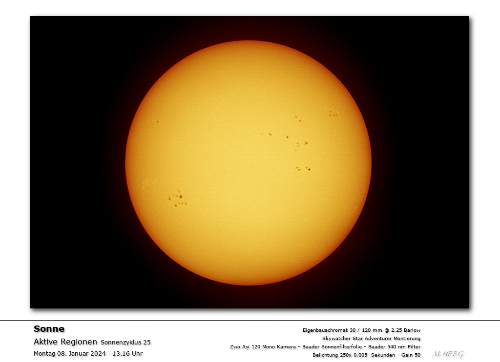 Hallo liebe Sonnenbeobachter. Auch mit geringem Aufwand und kleiner Ausrüstung ist die Sonne gut beobachtbar. Sie hierzu auch die Infos der Bildunterschrift. Meine Ablichtung zeigt die Sonnenaktivität im 25ten Zyklus bei 540 nm. Viele Grüße an alle sendet Marco Heeg aus Bingen am Rhein