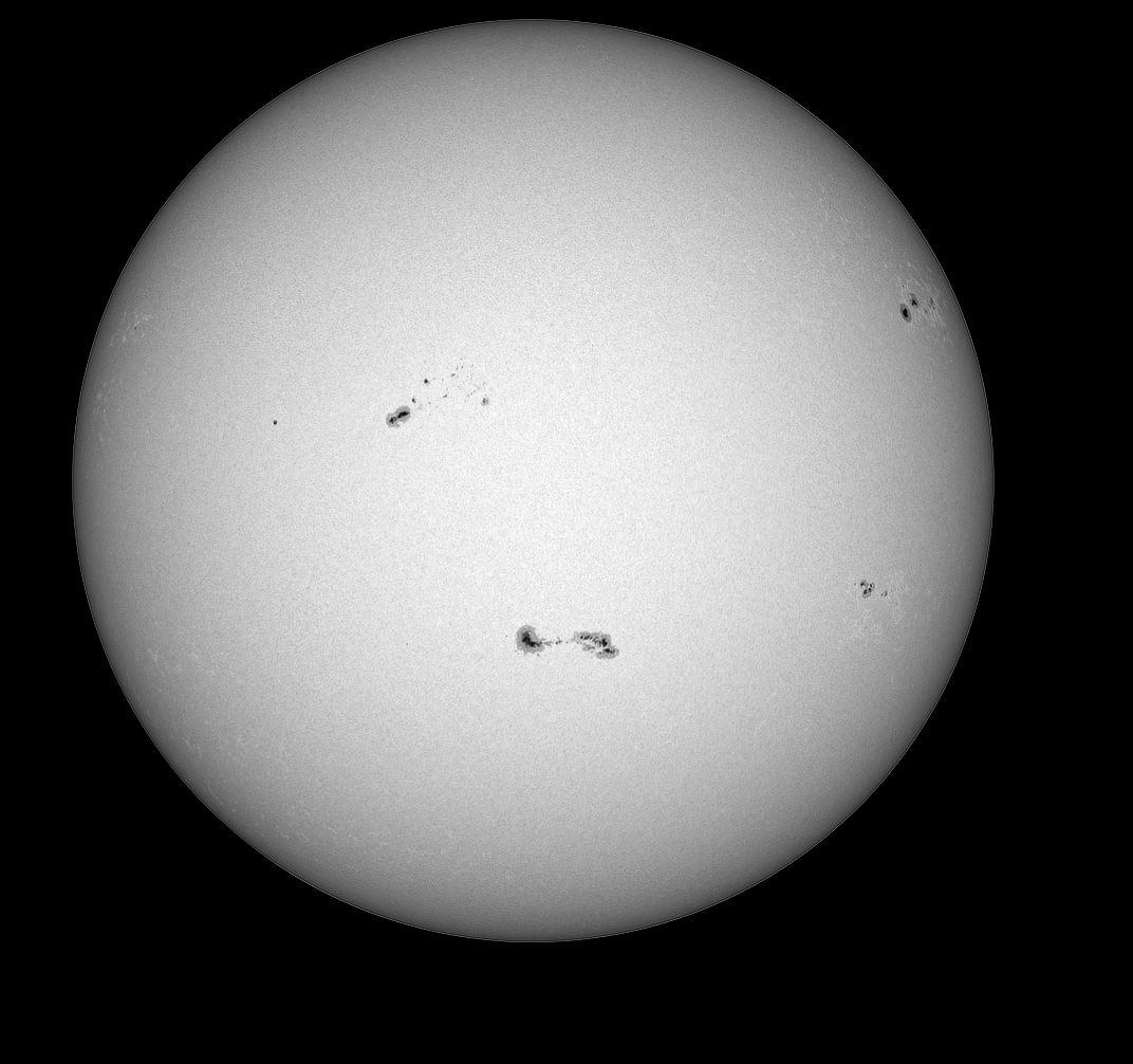 Sonne im Weißlicht. Mosaik aus 6 Bildern, Videofiles je 30 Sek. aufgenommen mit einer ZWO ASI178MM Kamera, zerlegt und gestackt mit AutoStakkert, Mosaik erstellt mit iMerge und bearbeitet mit ImPPG. Teleskop Vixen ED 102/920mm.