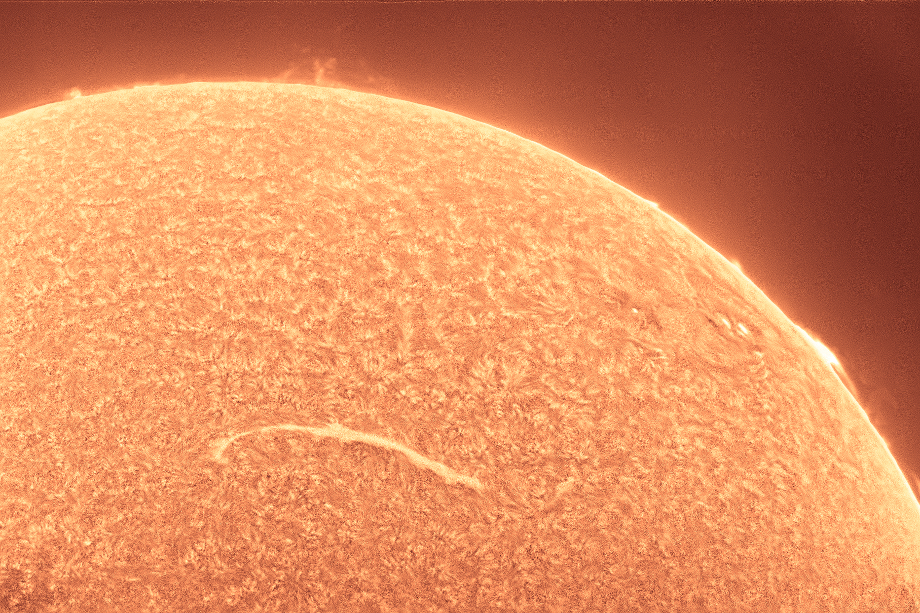 Die Kraft des kosmischen Glutofens im Zentrum unseres Planetensystems in einem Bild festgehalten. Klar ist die körnige Oberfläche der Sonne und eine große Protuberanz von oben zu sehen. Die enorme Strahlung der Sonne ist beim Anblick des Bildes regelrecht spürbar.