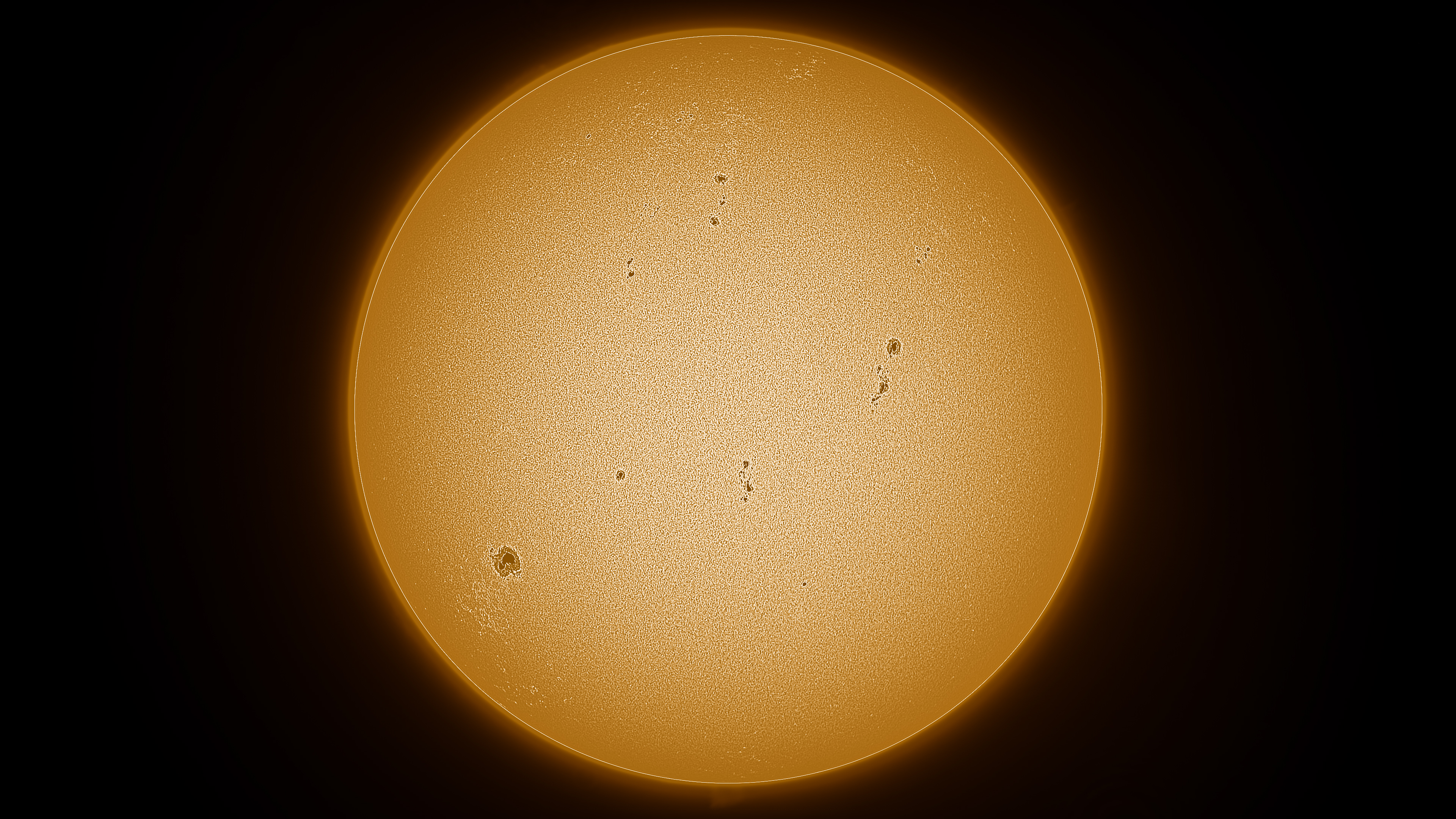 Unsere Sonne von heute 12:00 mittags. Es ist eine Zusammensetzung aus zwei Bildern. Das erste Bild ist aufgenommen mit einem Herschelkeil und Continiuumfilter. Das zweite Bild mit einem H-Alpha-Filter und Herschelkeil. Ganz leicht kommen die Protuberanzen zum Vorschein.