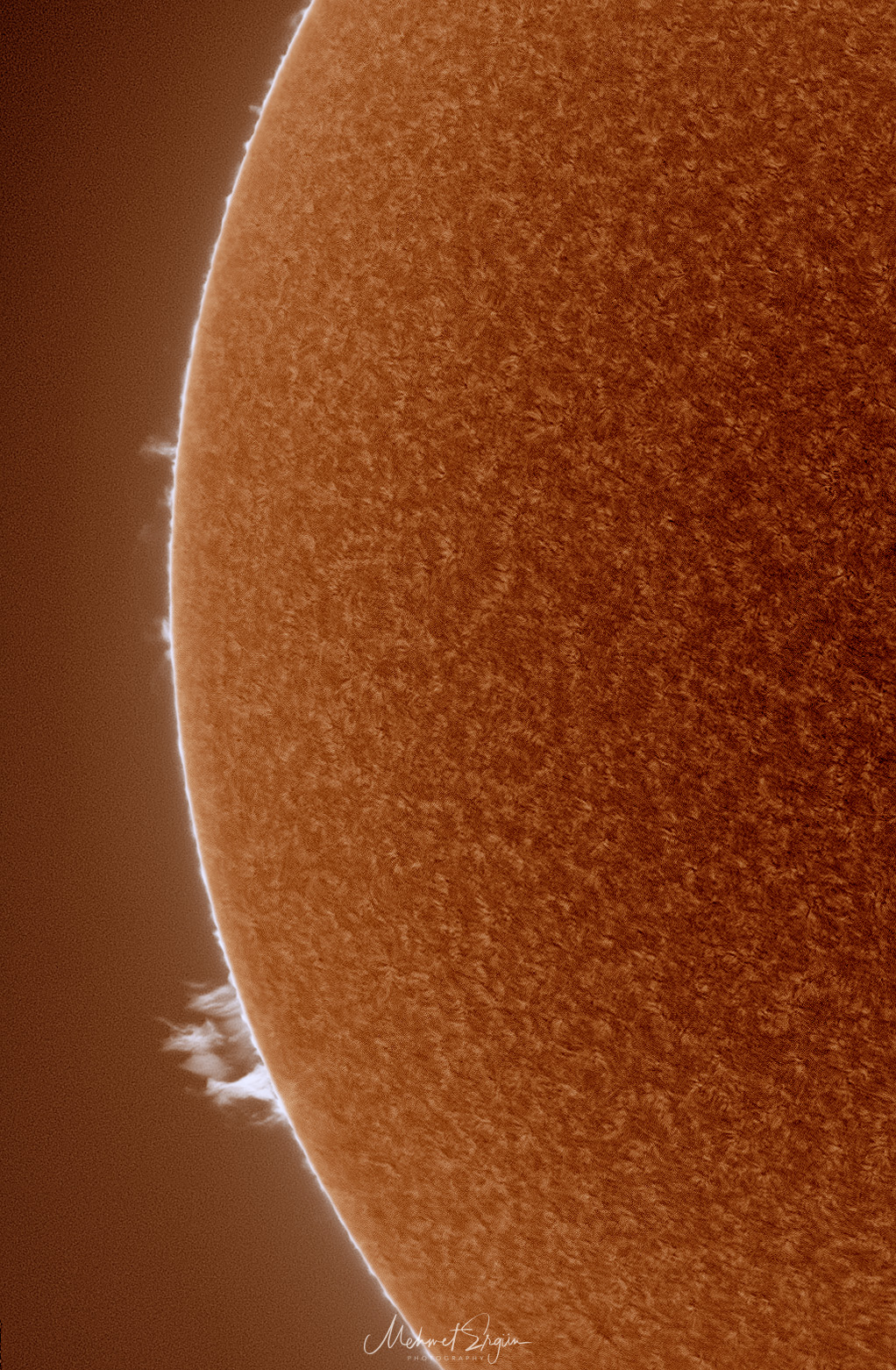 Die Sonnenaufnahme ist von heute (2. Mai 2020) mittag. Die Protuberanzen (am Sonnenrand leuchtende Bereiche) schätze ich auf rund 75000 bis 100000 Kilometer groß.
