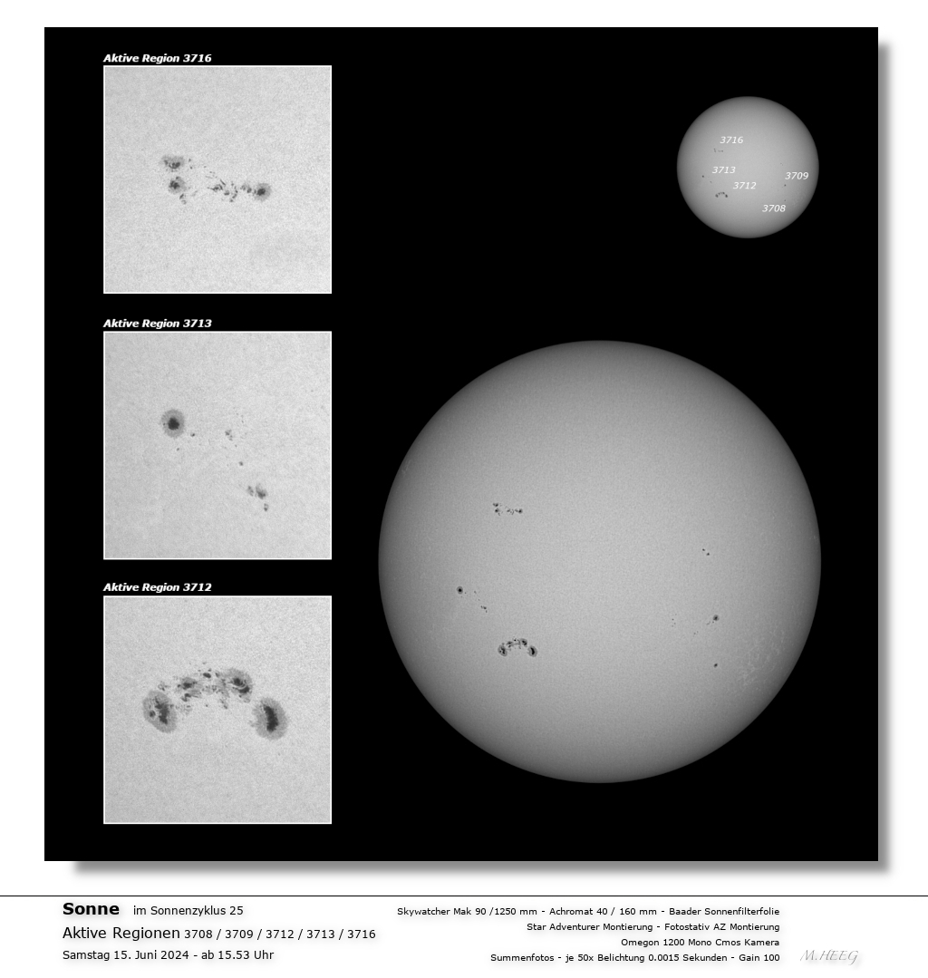 Aktive Regionen der Sonne. Beobachtungen im 25. Sonnenzyklus. Eine tolle (?) Sonnenbeobachtung mit unterschiedlicher Optik. Zu sehen ist ein Zusammenstellung verschiedener Aufnahmen. Sie zeigen in Übersicht die Gesamtsonne und die aktiven Regionen im Detail. Beides war auch visuell eine Augenweide. Luftruhe und Durchsicht waren sehr gut. Wie immer bin ich sehr zufrieden. Wenig Aufwand und maximaler Hobbyspass ... einfach toll! Gruss an alle sendet Marco Heeg aus Bingen am Rhein