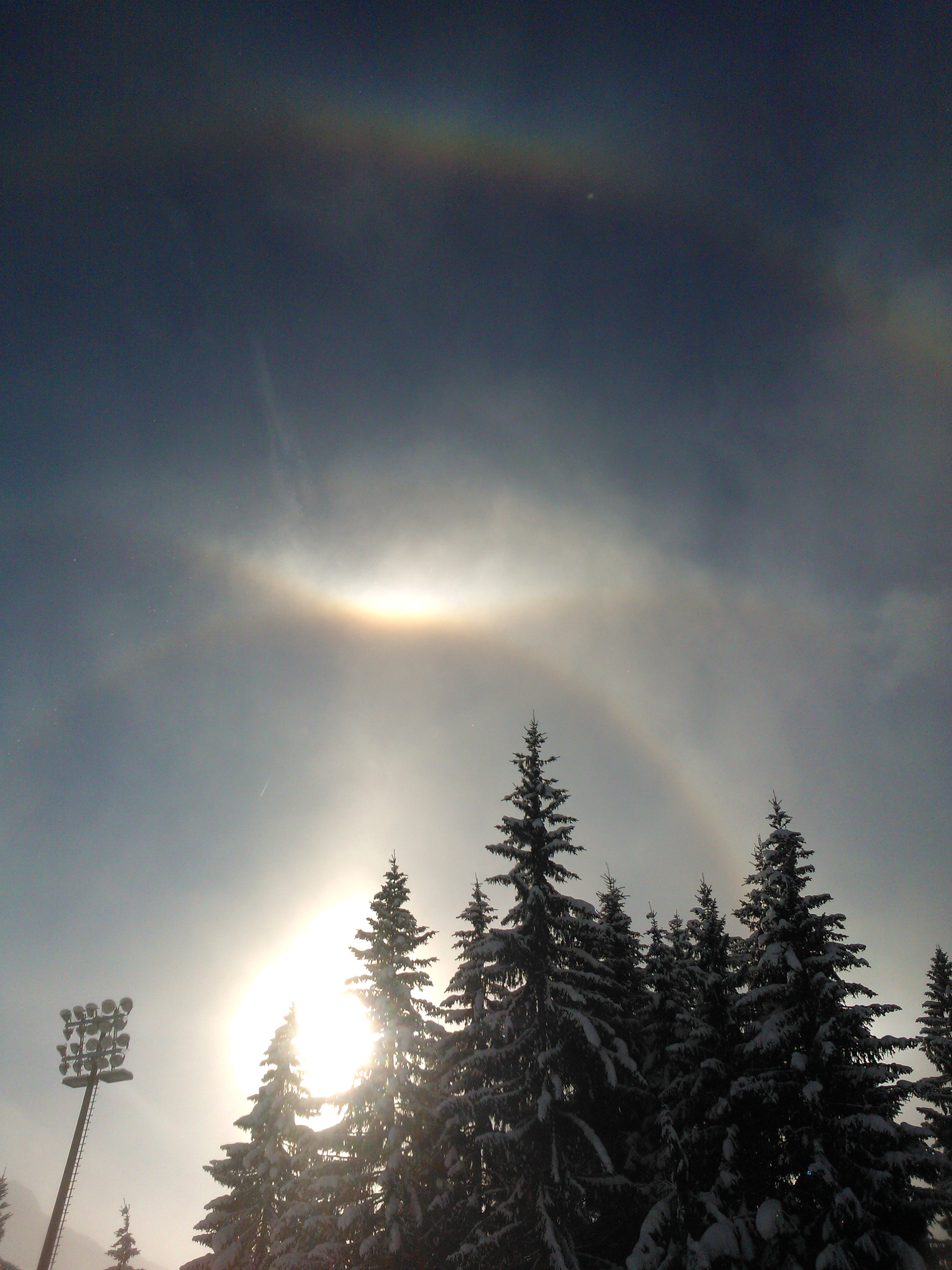 Sonnen-Halo mit Nebensonne, 22° und 46°-Ring. Aufgenommen von der Schipiste aus in 1500 Meter Höhe. Nach warmen und feuchten Tagen war es an diesem Tag sehr kalt.